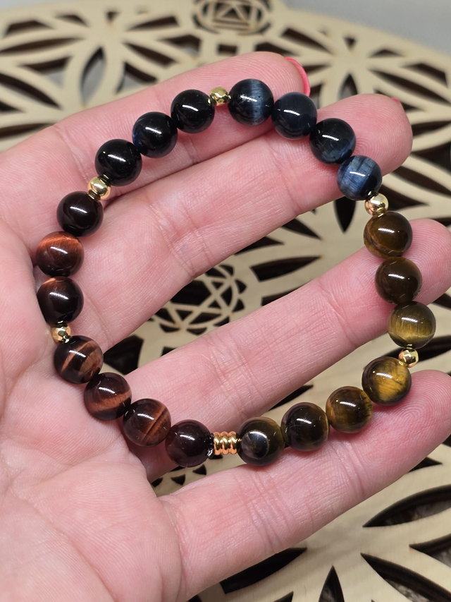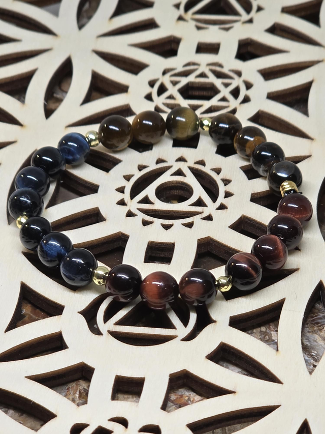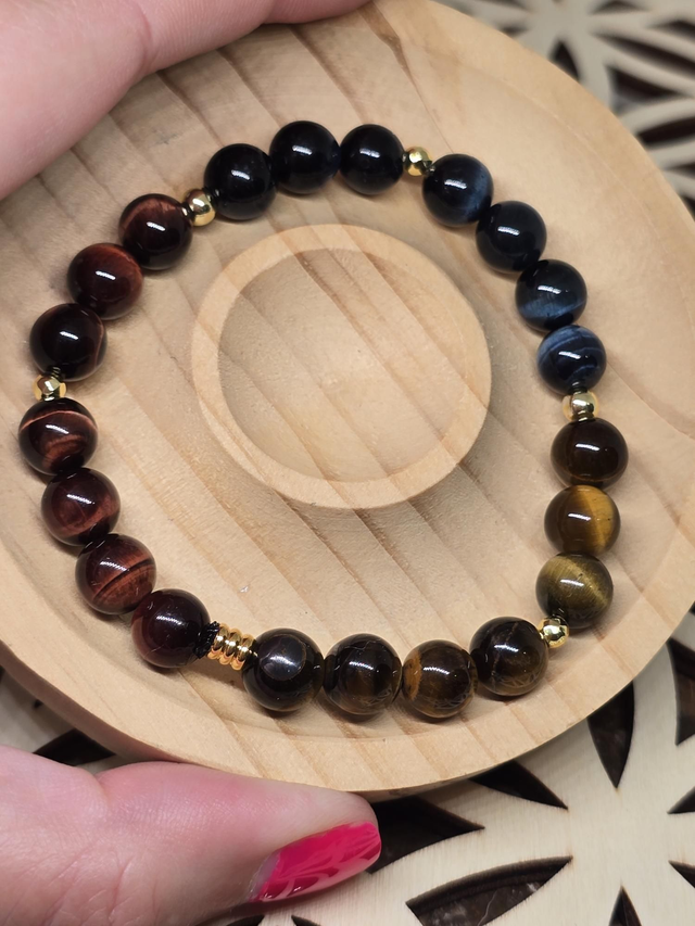 Bracelet "3 œils" fait main sur fil élastique composé d'œil de Tigre, de Taureau et de Faucon en 0,8 cm ainsi que de perles en acier inoxydable