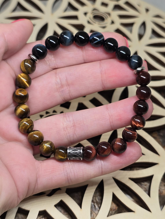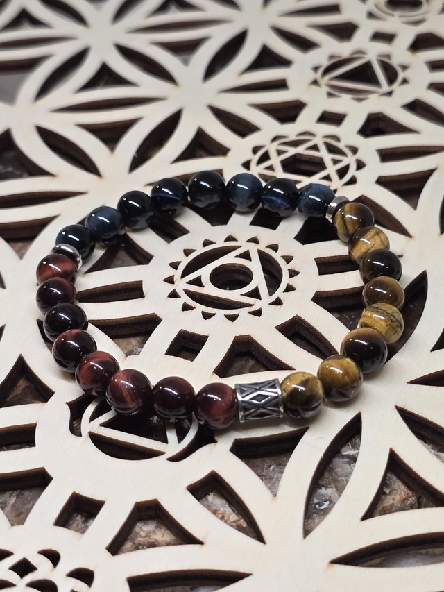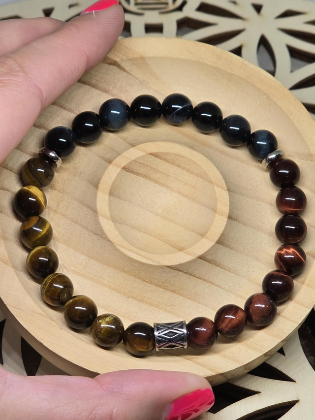 Bracelet "3 œils" fait main sur fil élastique composé d'œil de Tigre, de Taureau et de Faucon en 0,8 cm ainsi que de perles en acier inoxydable