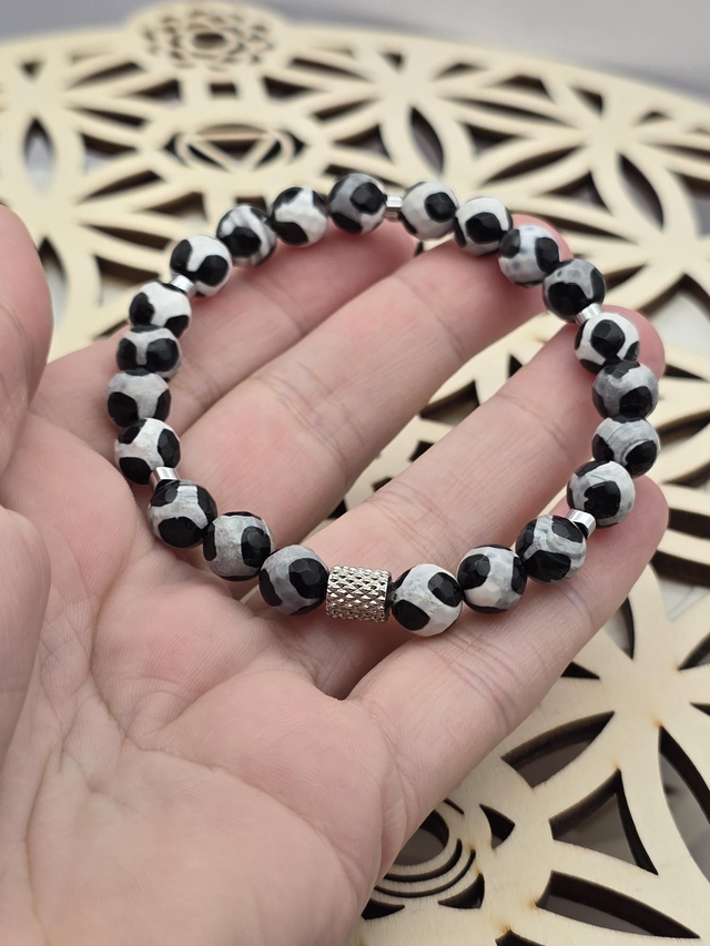 Bracelet fait main sur fil élastique solide composé d'Agate du Tibet en 0,8 cm ainsi que de perles en hématite plaquée et acier inoxydable.