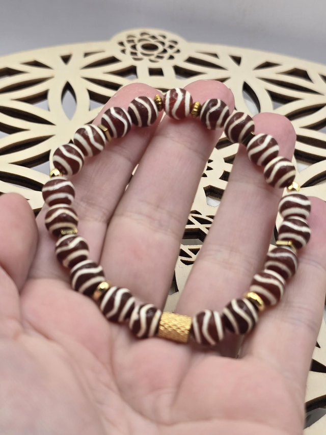 Bracelet fait main sur fil élastique solide composé d'Agate du Tibet en 0,8 cm ainsi que de perles en hématite plaquée et acier inoxydable.