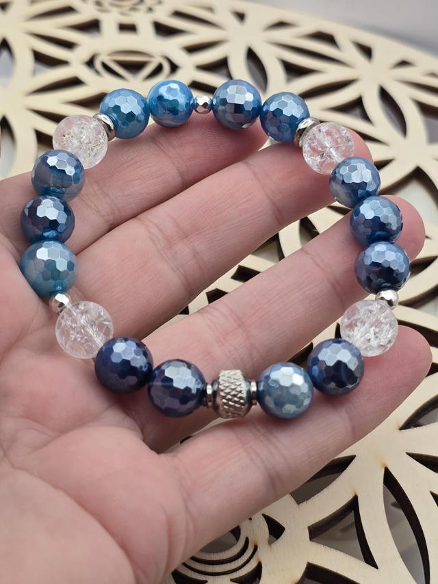 Bracelet fait main sur fil élastique solide composé de Cristal de roche et Agate teintée à facettes en 1 cm ainsi que de perles en hématite plaquée et acier inoxydable.