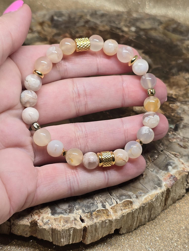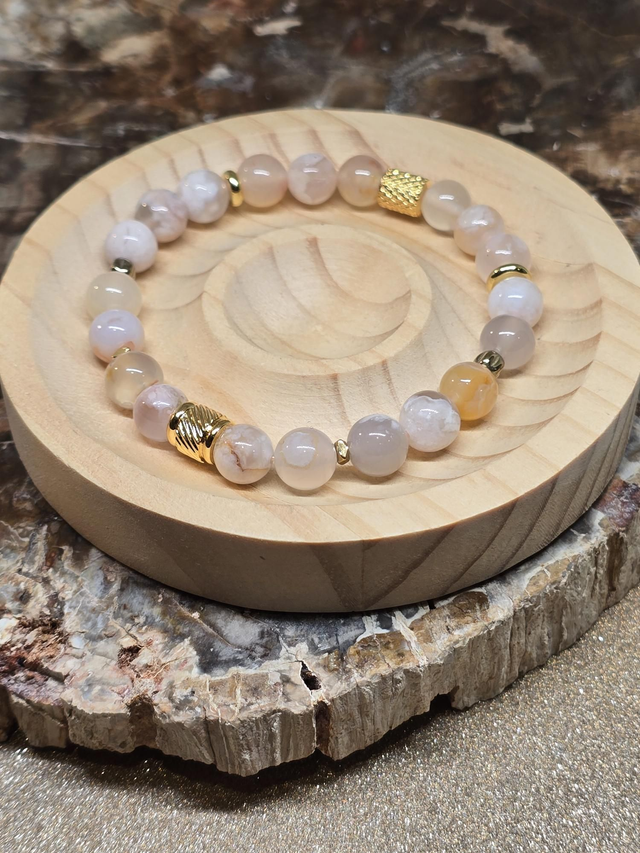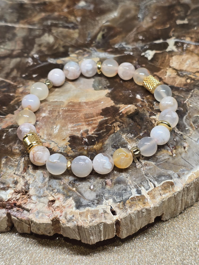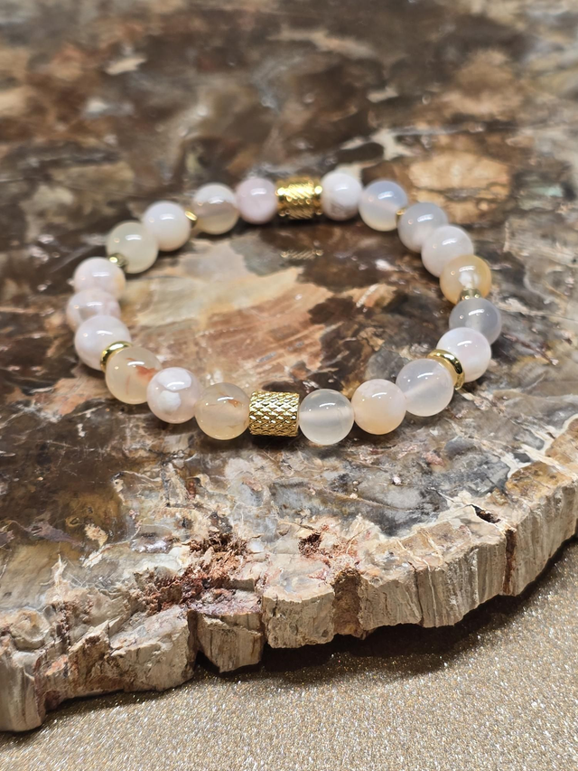 ✨ Bracelet fait main sur fil élastique solide composé d'Agate fleur de cerisier en 0,8 cm ainsi que de perles plaquées et acier inoxydable doré.