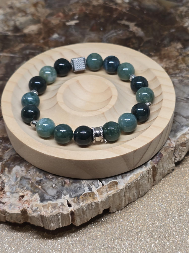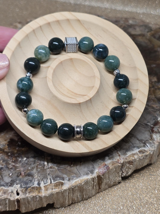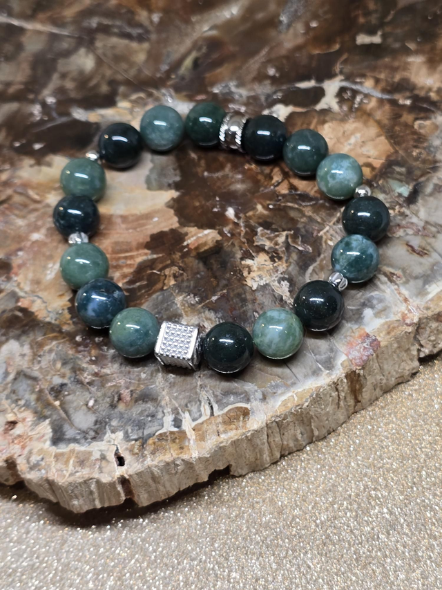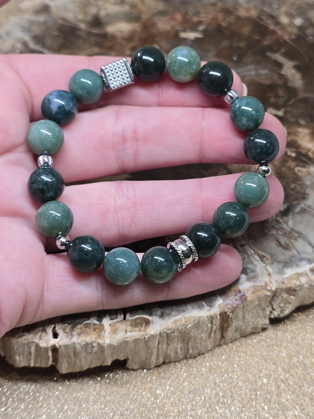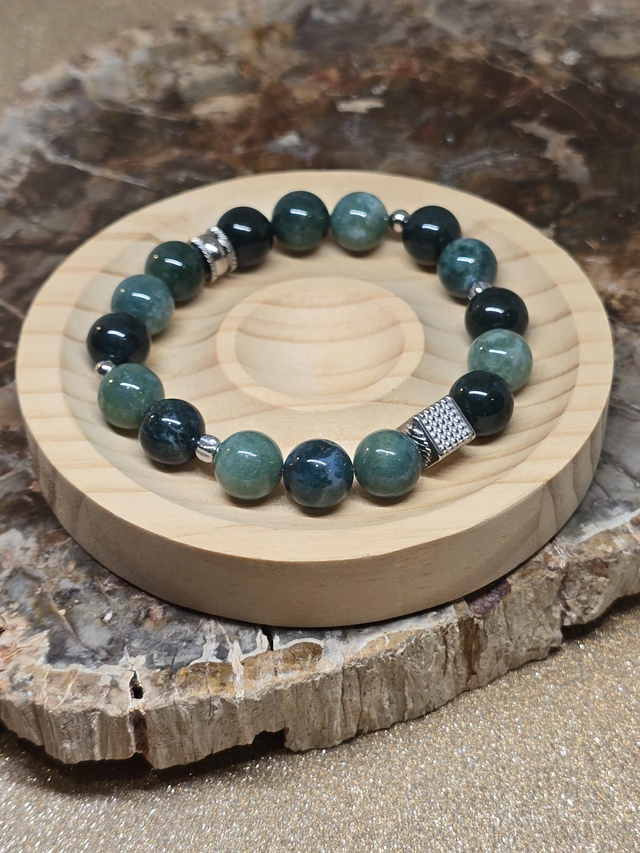 ✨Bracelet fait main sur fil élastique solide composé d'Agate mousse en 1 cm ainsi que de perles en acier inoxydable.
