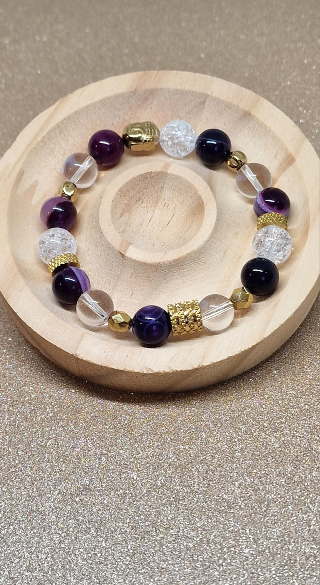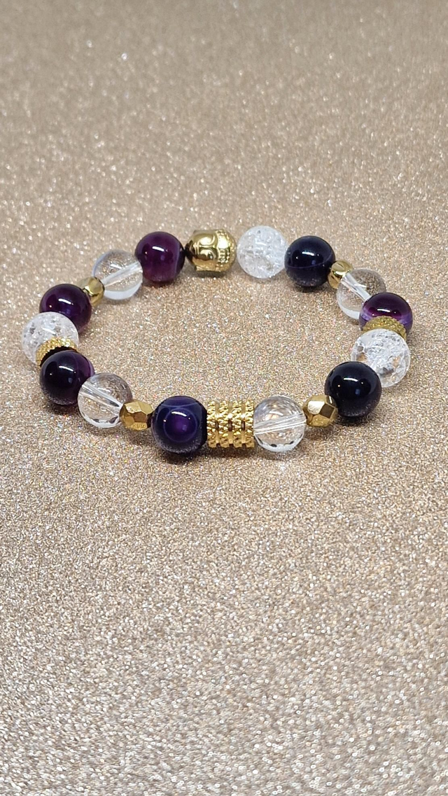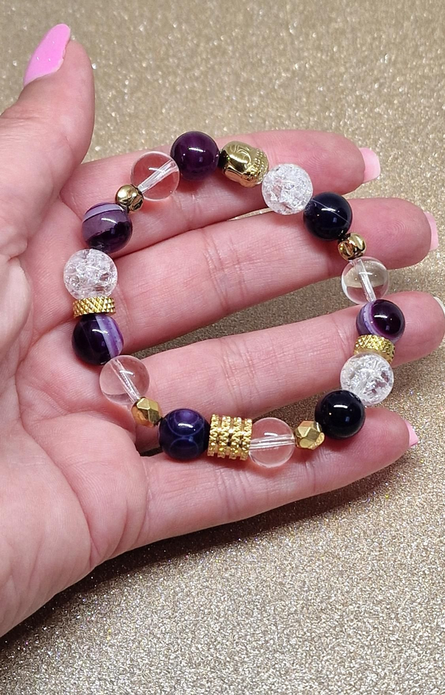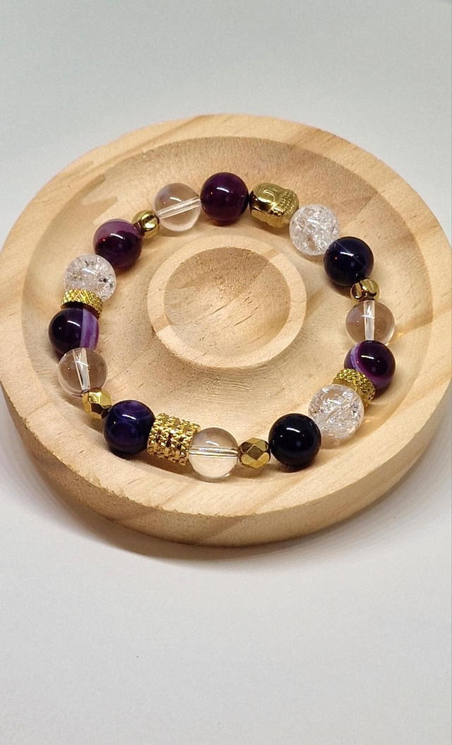 ✨Bracelet fait main sur fil élastique solide composé d'Agate rayée mauve et Cristal de roche craquelé et transparent en 1 cm ainsi que de perles dorées à l'or fin et en acier inoxydable doré