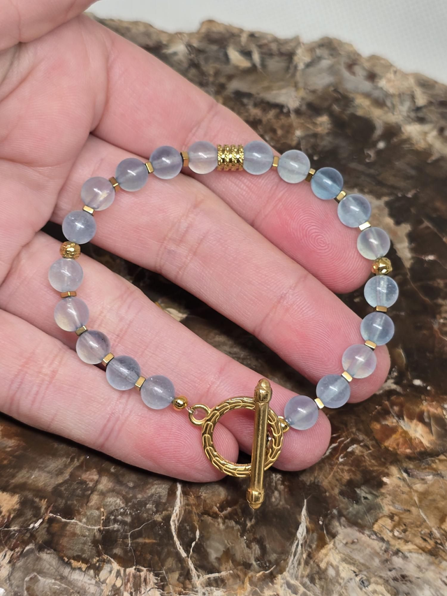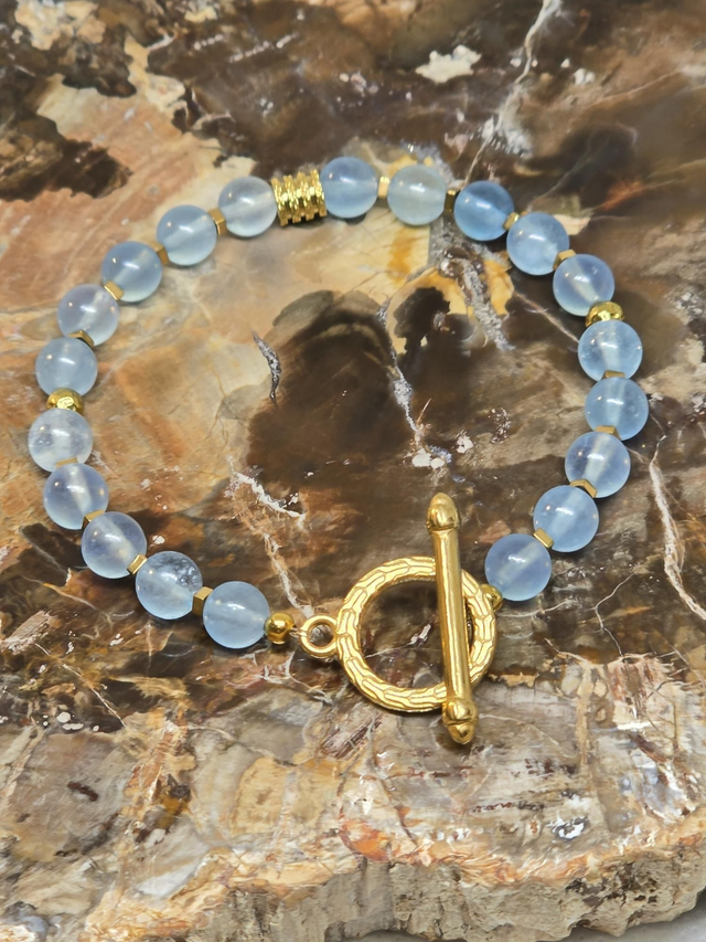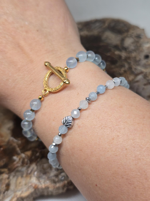 Bracelet fait main sur fil fixe avec fermoir en T en acier inoxydable, composé d'Aigue marine haute qualité en 0,6 cm ainsi que de perles en hématite plaquées et acier inoxydable.