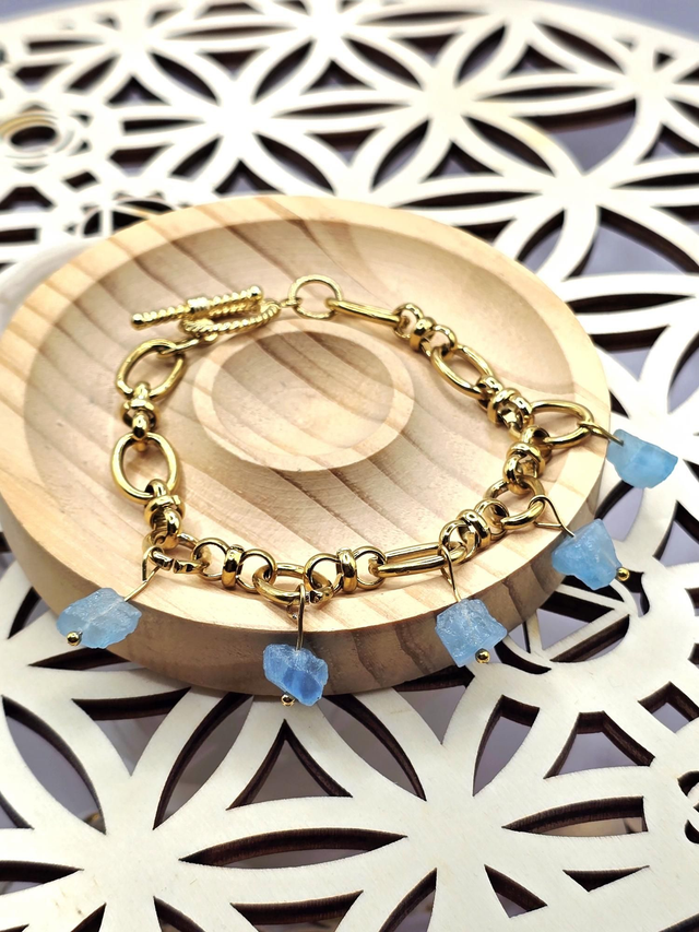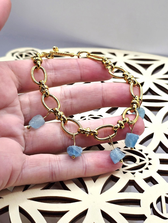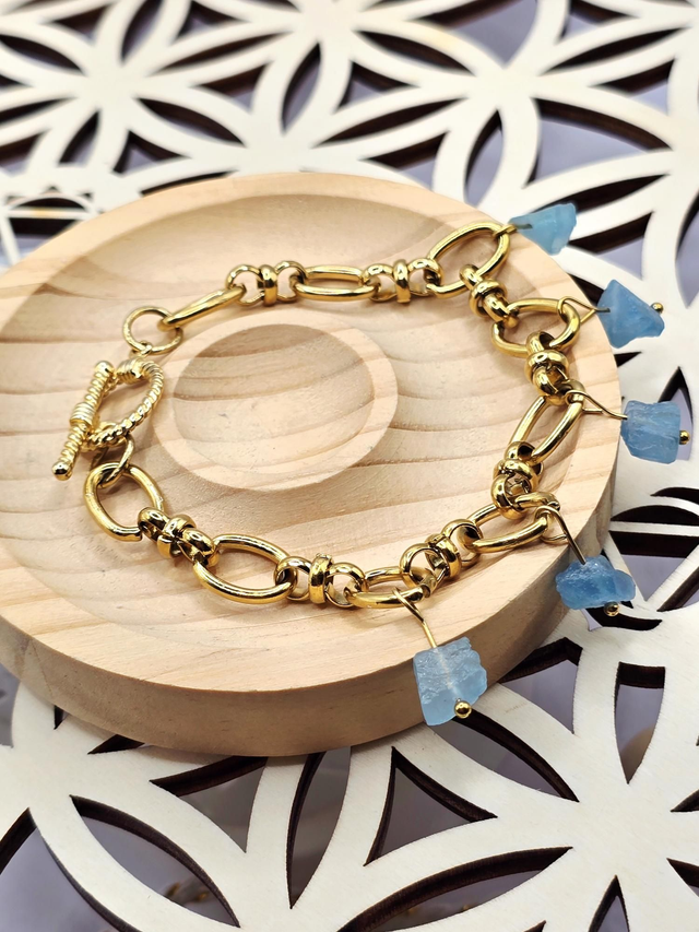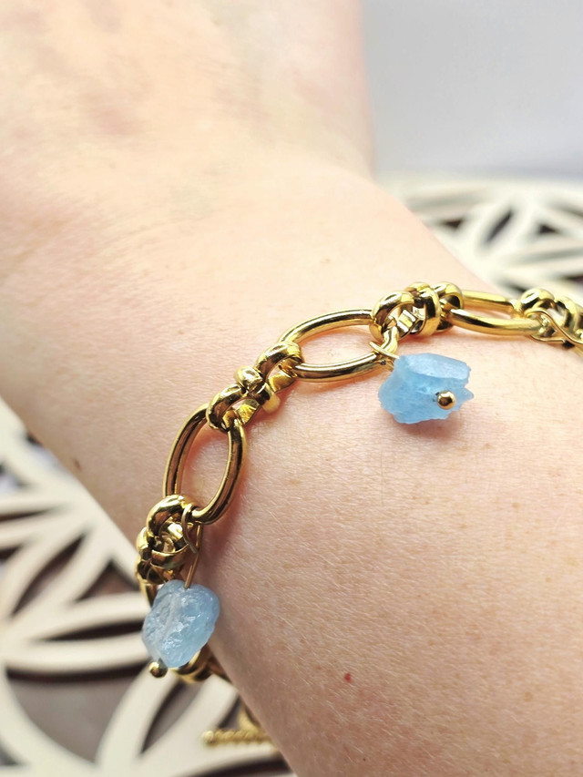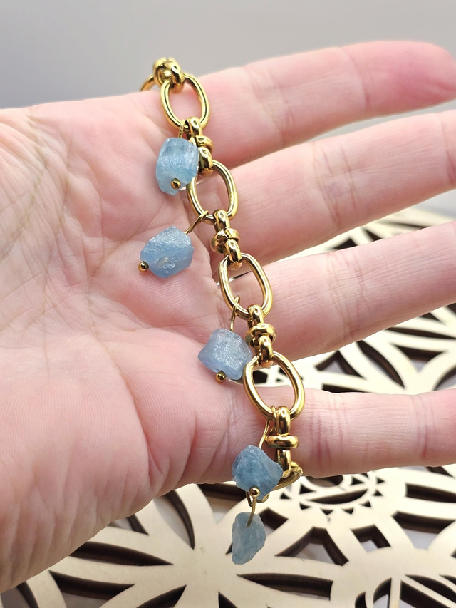 Bracelet fait main avec chaîne en grosse maille en acier inoxydable doré. Fermoir en T en acier inoxydable. Pierre brute d'Aigue marine.