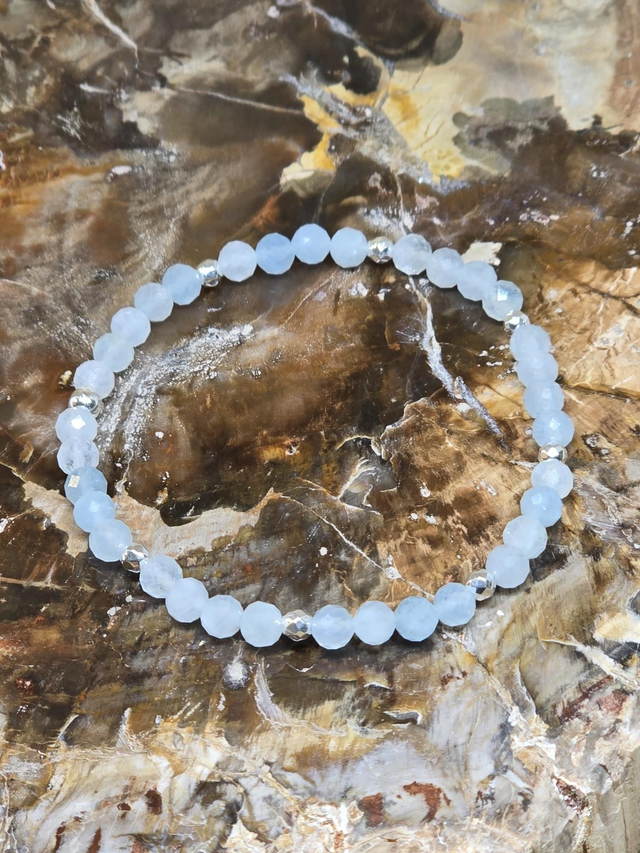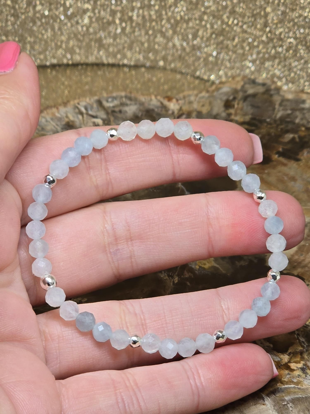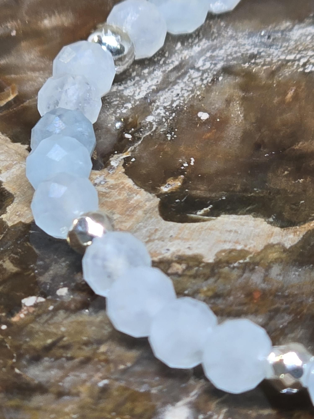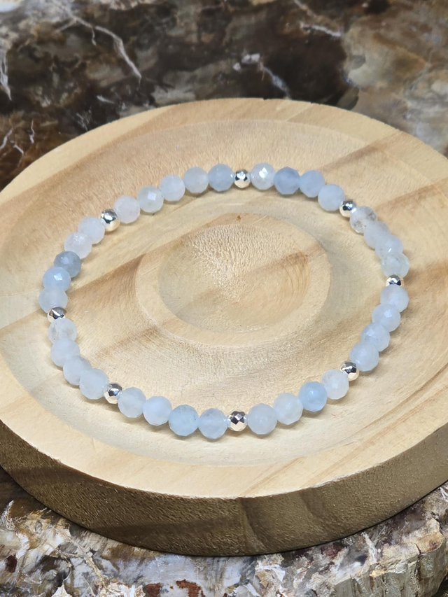 Bracelet fait main sur fil élastique solide composé d'Aigue marine qualité A en 0,6 cm à facettes ainsi que de perles en plaqué argent.