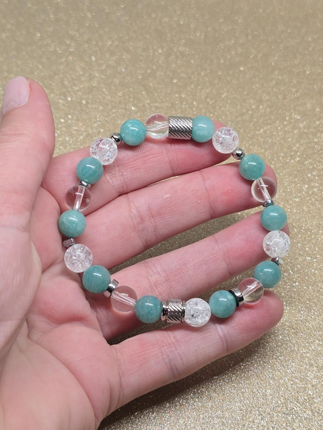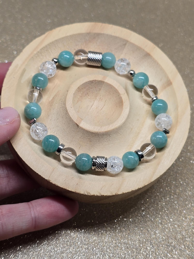✨ Bracelet fait main sur fil élastique solide composé d'Amazonite et Cristal de roche transparent et craquelé en 0,8 cm ainsi que de perles plaquées et acier inoxydable.