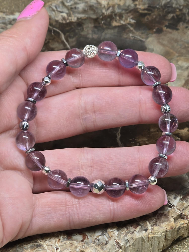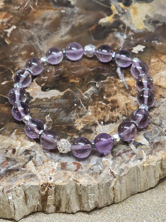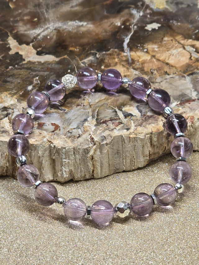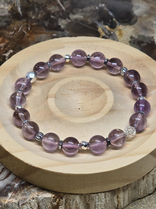 🌟 Bracelet fait main sur fil élastique solide, composé d'Améthyste claire qualité AAA en 0,8 cm ainsi que de perles en hématite plaquée et acier inoxydable.