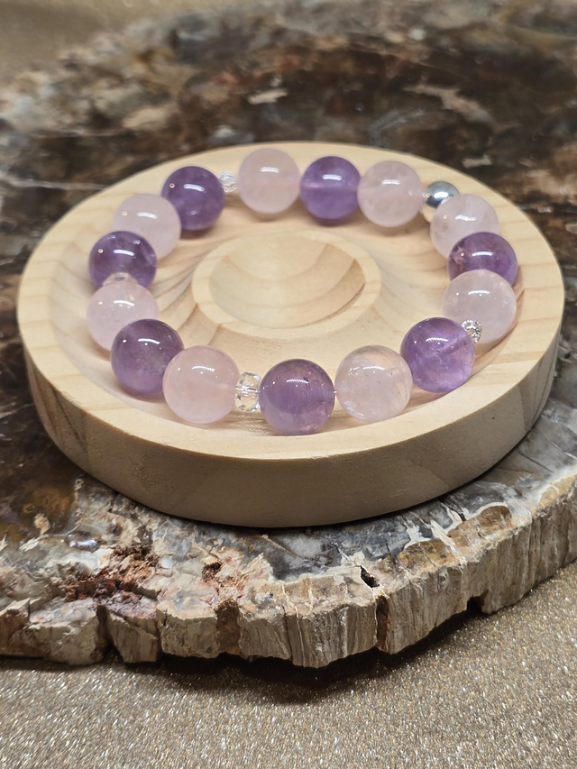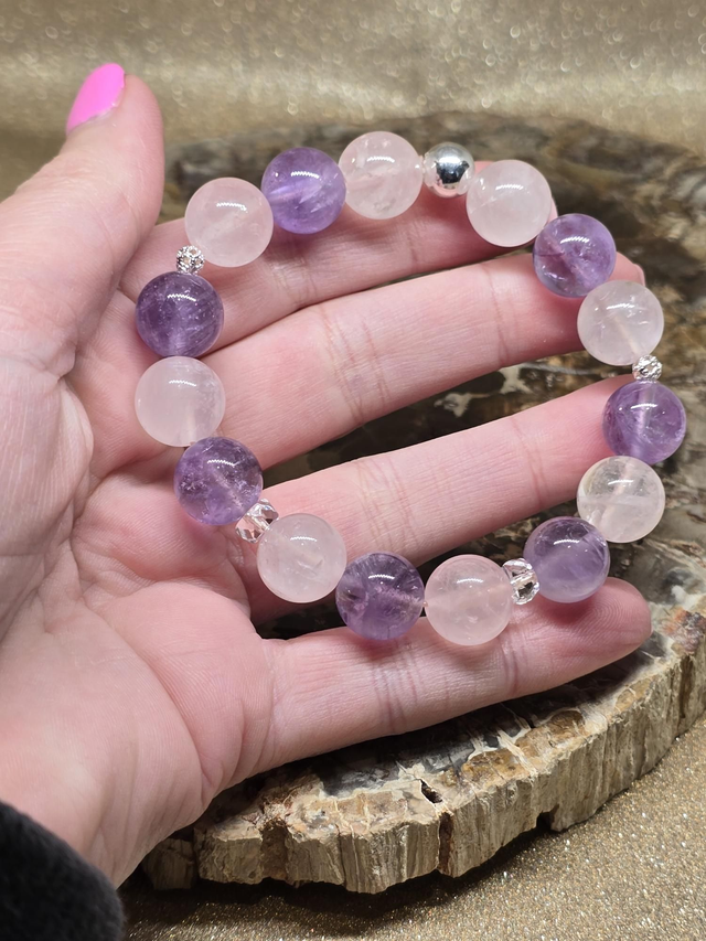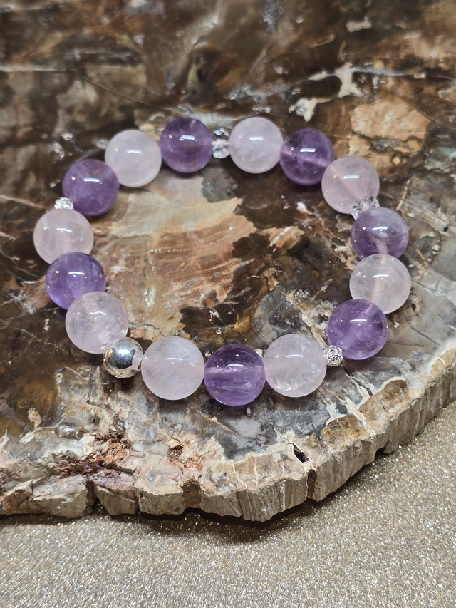 Bracelet fait main sur fil élastique solide, composé d'Améthyste lavande et Quartz rose XL en 1,2 cm ainsi que de perles en argent plaqué.