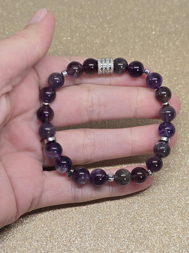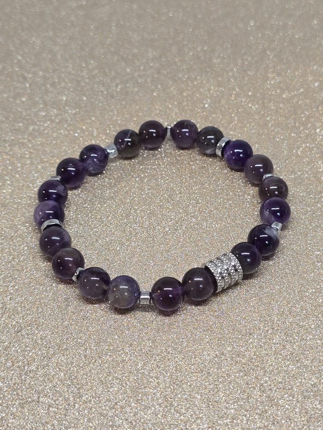 ✨ Bracelet fait main sur fil élastique solide composé d'Améthyste en 0,8 cm ainsi que de perles plaquées et acier inoxydable.