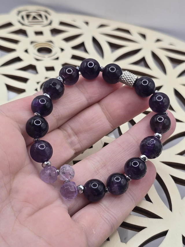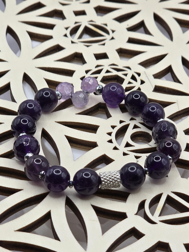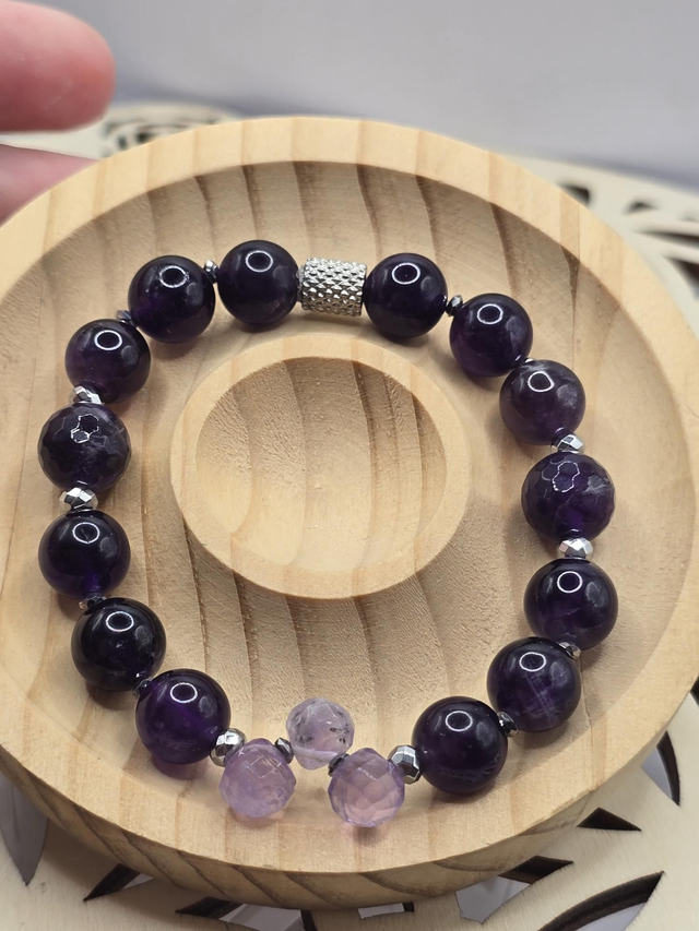 Bracelet fait main sur fil élastique solide composé d'Améthyste foncée en 1 cm et claire en forme de goutte à facettes & de perles en hématite plaquée et acier inoxydable.