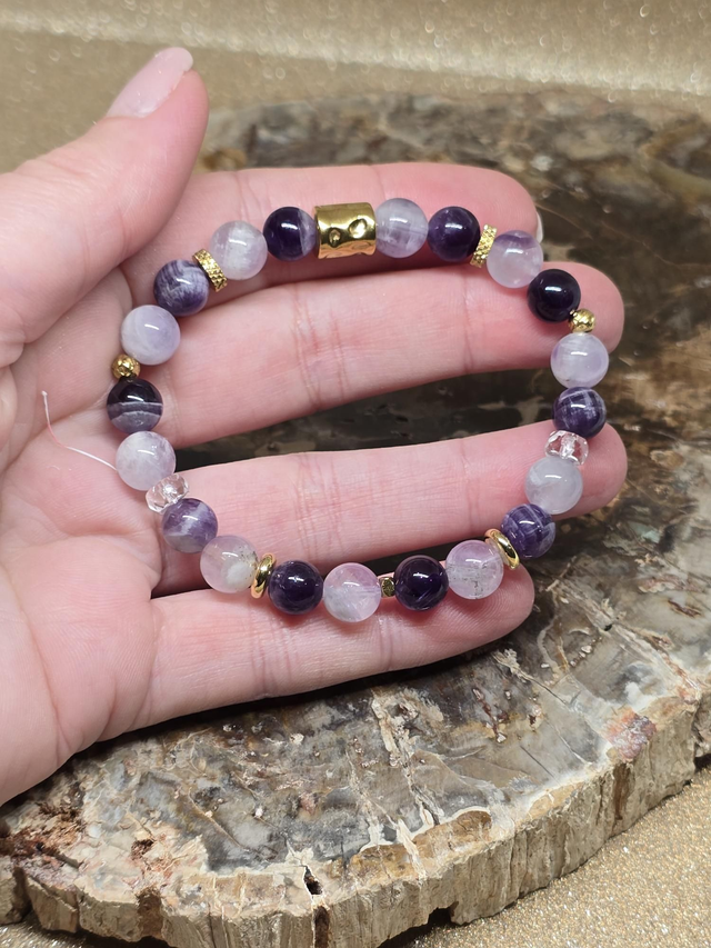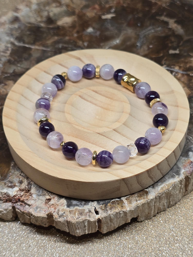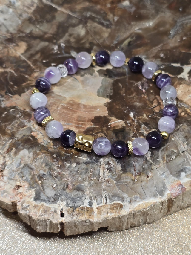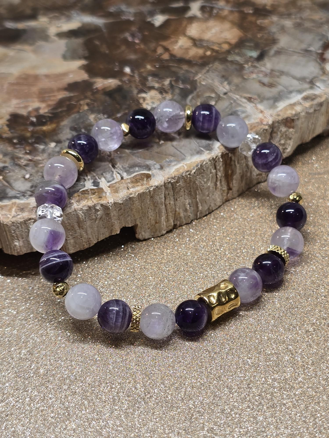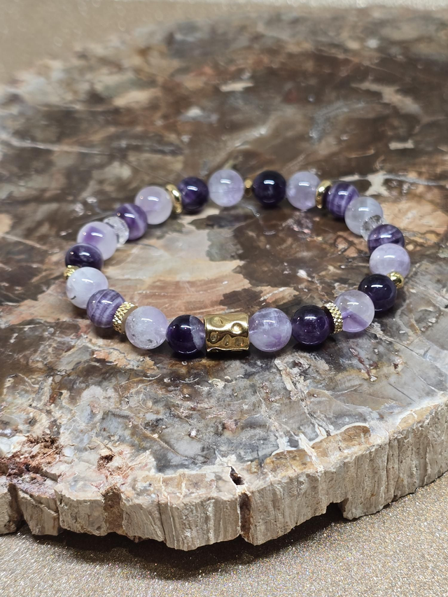 ✨ Bracelet fait main sur fil élastique solide composé d'Améthyste 2 tons : chevron et lavande, en 0,8 cm ainsi que de perles en acier inoxydable.