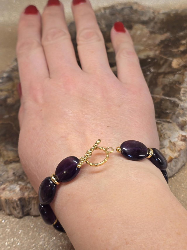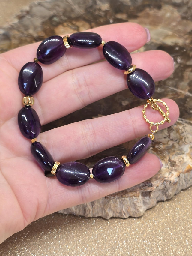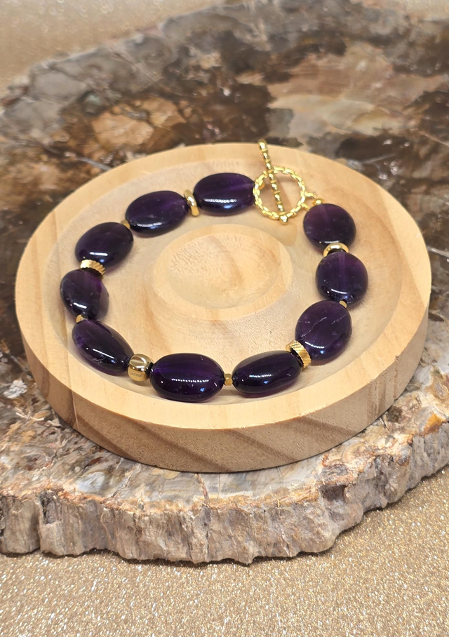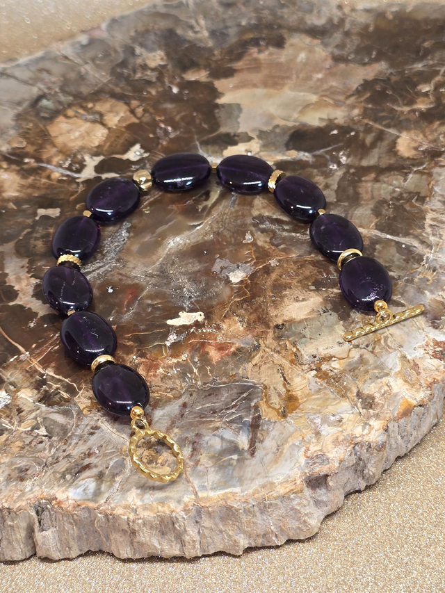 ✨ Bracelet fait main sur fil élastique fixe composé d'Améthyste foncée forme ovale d'environ 1,5 cm, perles et fermoir en T en acier inoxydable doré.