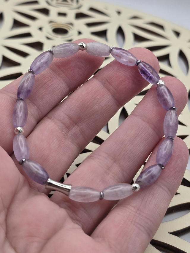 Bracelet fait main sur fil élastique solide, composé d'Améthyste ovale ainsi que de perles en hématite plaquée et acier inoxydable.