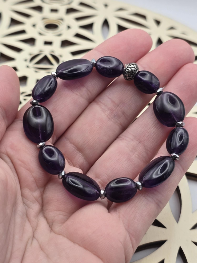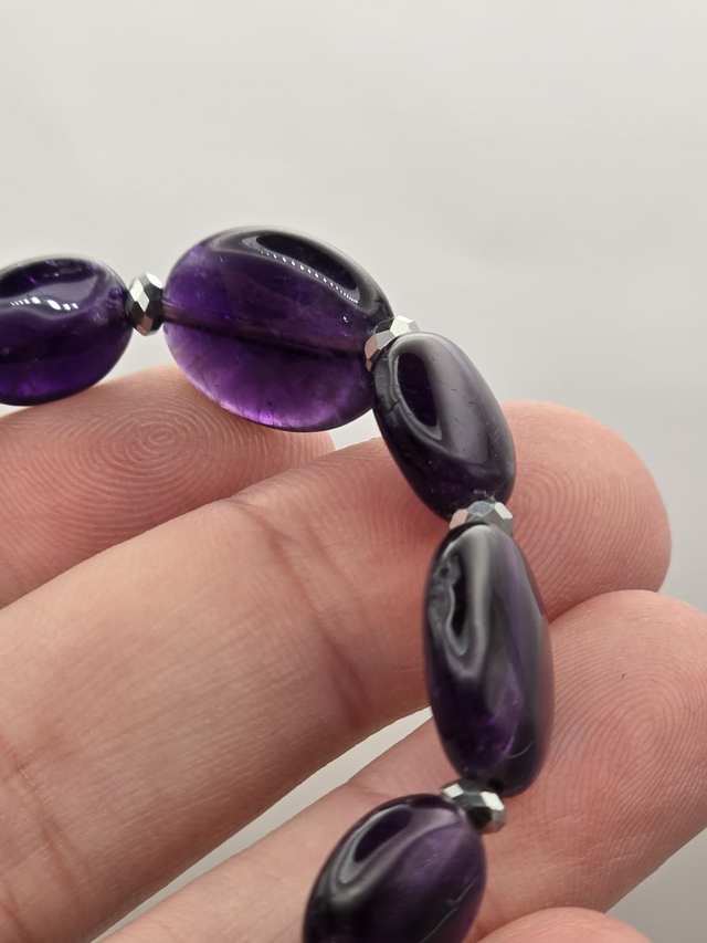 Bracelet fait main sur fil élastique solide, composé d'Améthyste ovale foncée ainsi que de perles en hématite plaquée et acier inoxydable.