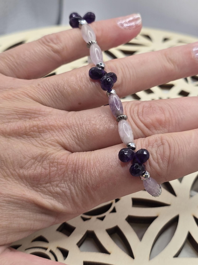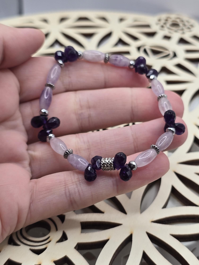 Bracelet fait main sur fil élastique solide composé d'Améthyste claire en forme de tube, Améthyste foncée forme goutte, ainsi que de perles en hématite plaquée et acier inoxydable.