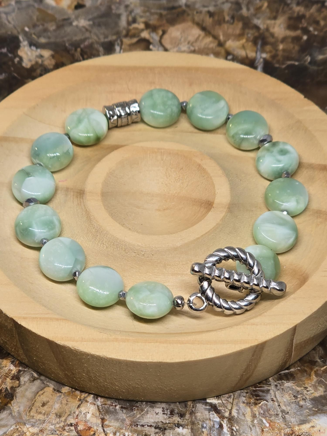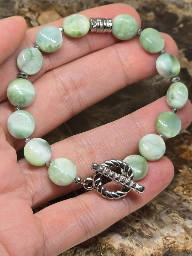 Bracelet fait main sur fil fixe avec fermoir en T en acier, composé d'Angélite verte forme ronde plate en 1 cm, ainsi que de perles en hématite plaquée et acier inoxydable.