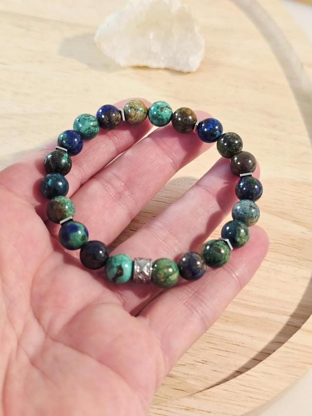 Bracelet fait main sur fil élastique solide composé d'Azurite Malachite en 0,8 cm et perles en hématite plaquée et acier inoxydable.