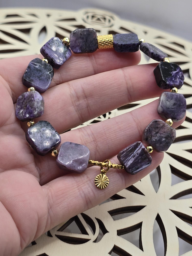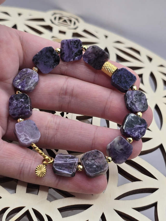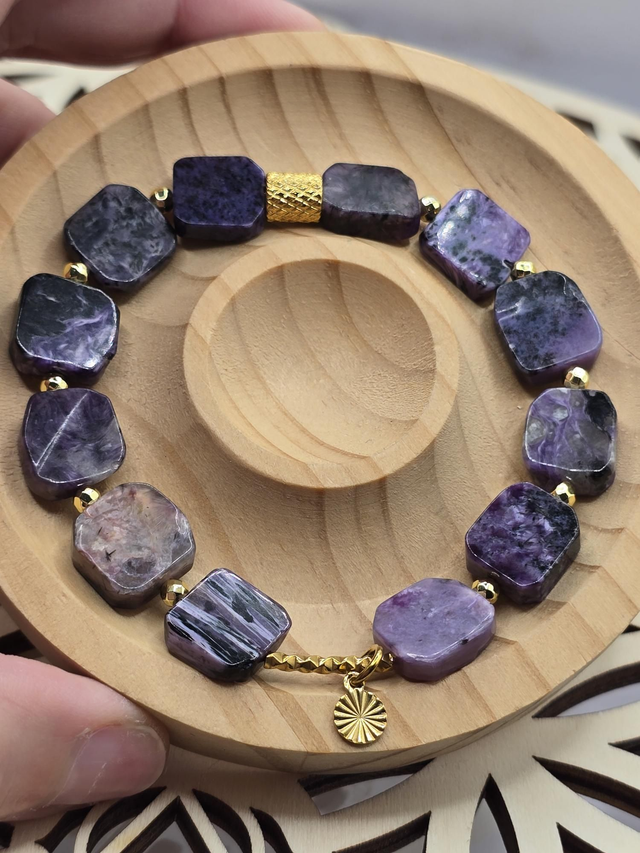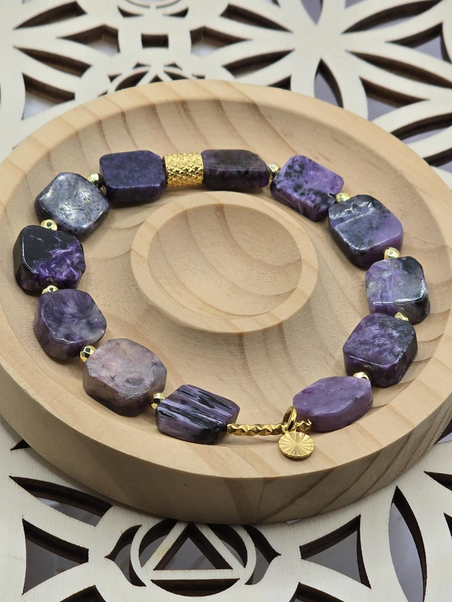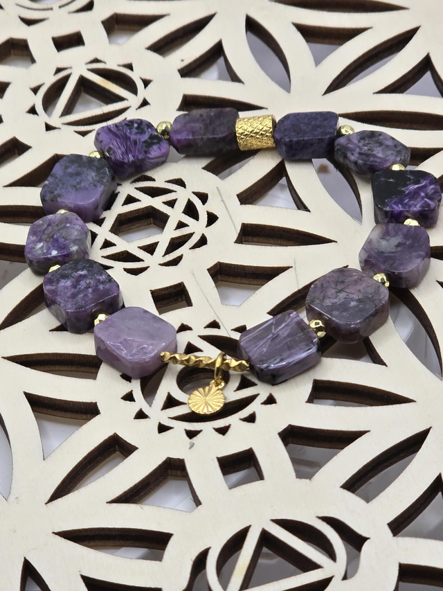 Charoïte : Chakra coronal (violet), aide le corps à retrouver son équilibre, stimule le système immunitaire (foie et pancréas), recharge en énergie le corps épuisé, aide à calmer les troubles autistiques et bipolaires, calme les tendances à avoir peur, guérison émotionnelle par l'acceptation du présent, aide à s'aimer, diminue l'impulsivité, aide à percevoir ce qui juste.