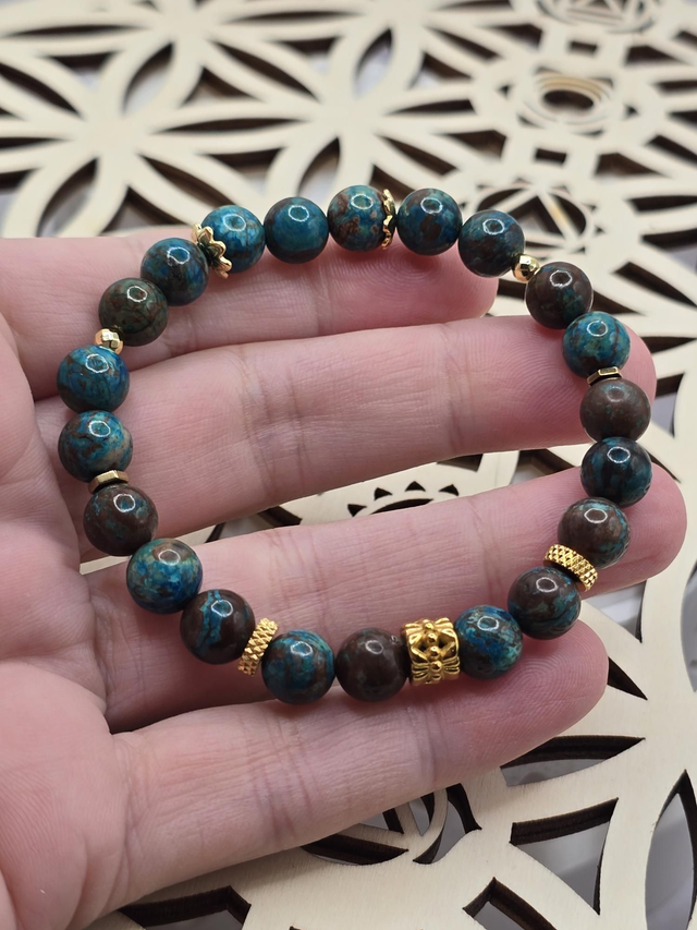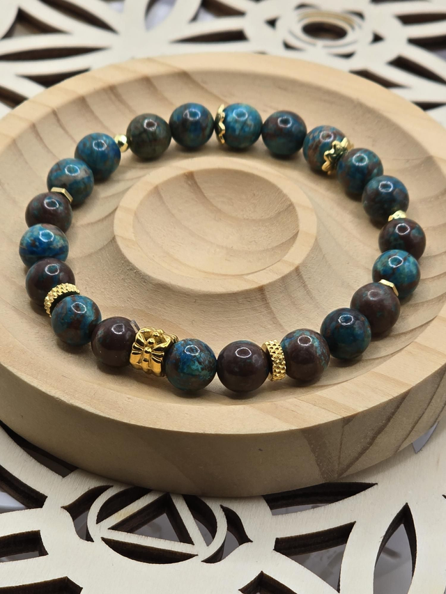 Bracelet fait main sur fil élastique solide composé de Chrysocolle en 0,8 cm ainsi que de perles en hématite plaquée et acier inoxydable.