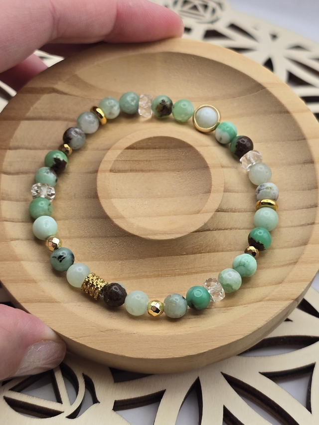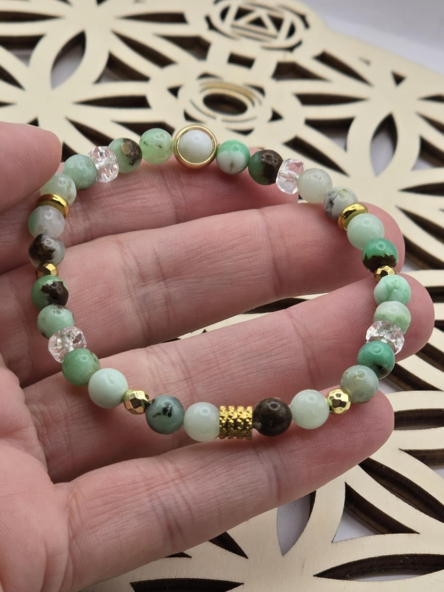 Chrysoprase : Chakra du cœur (vert) : apporte une grande sécurité et favorise la confiance en soi. Elle dégage une énergie très douce qui vous apporte harmonie, bienveillance, amour et compassion. Elle augmente également l'intuition et la créativité et aide à se concentrer sur les aspects positifs de la vie.