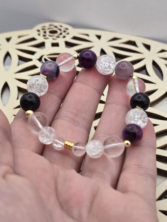 Bracelet fait main sur fil élastique solide composé de Cristal de roche et Agate teintée à facettes en 1 cm ainsi que de perles en hématite plaquée et acier inoxydable.