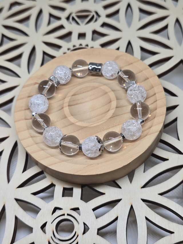 Bracelet fait main sur fil élastique solide composé de Cristal de roche XL transparent et craquelé en 1,2 cm ainsi que de perles en hématite plaquée et acier inoxydable.
