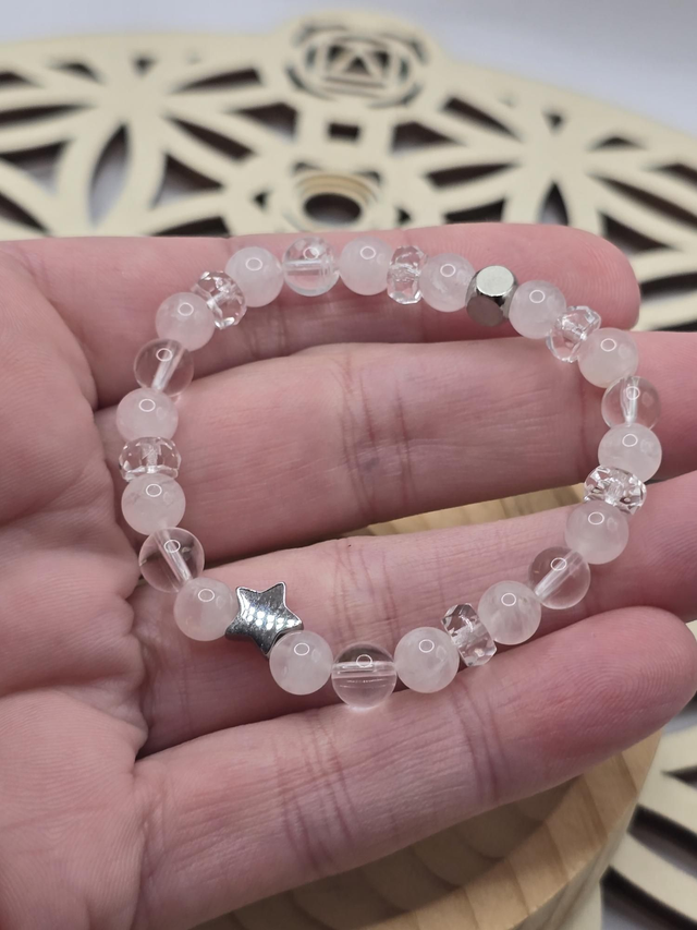 Bracelet fait main sur fil élastique solide composé de Quartz rose & Cristal de roche et perles en hématite plaquée et acier inoxydable.