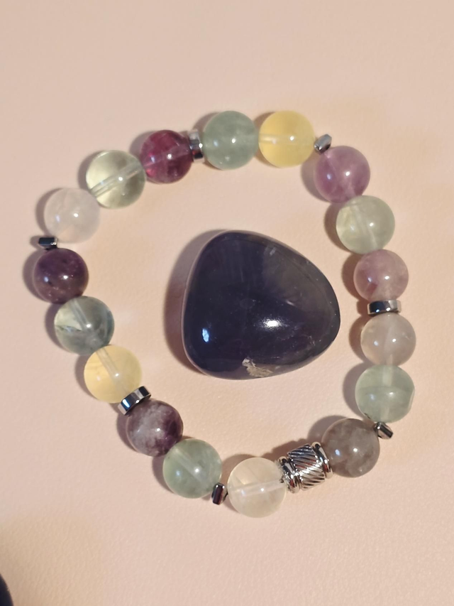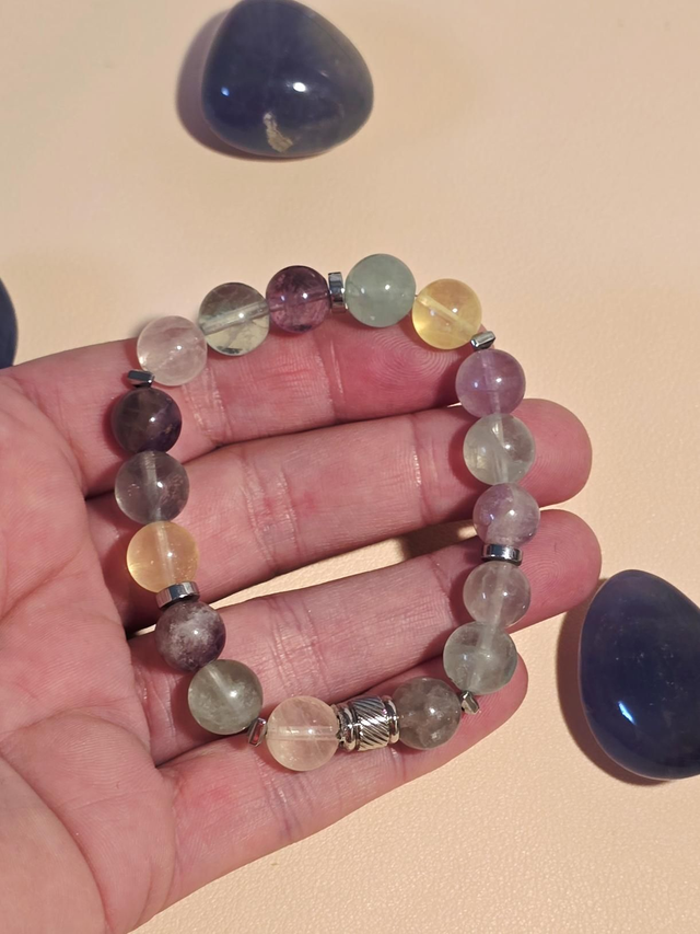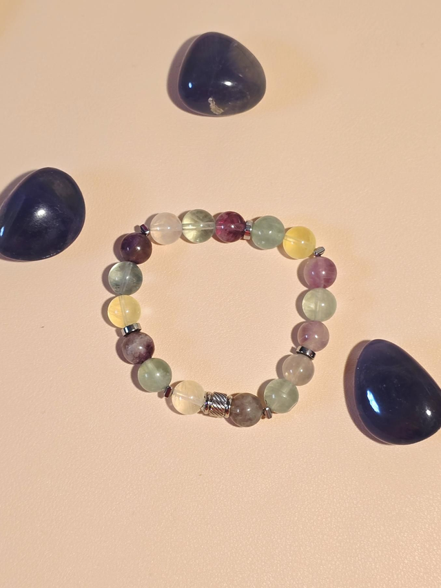 Bracelet fait main sur fil élastique solide composé de Fluorite en 1 cm ainsi que de perles en hématite plaquée et acier inoxydable.