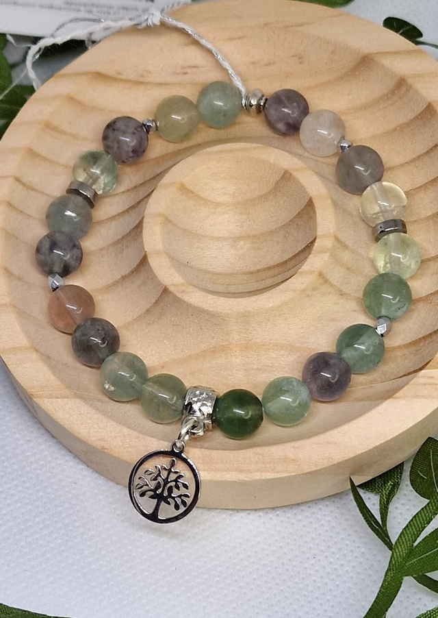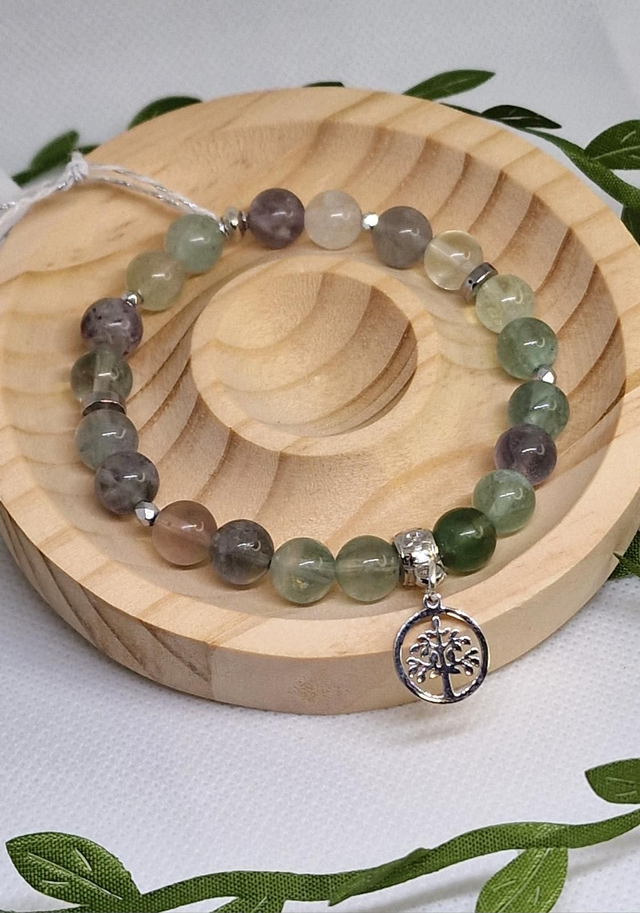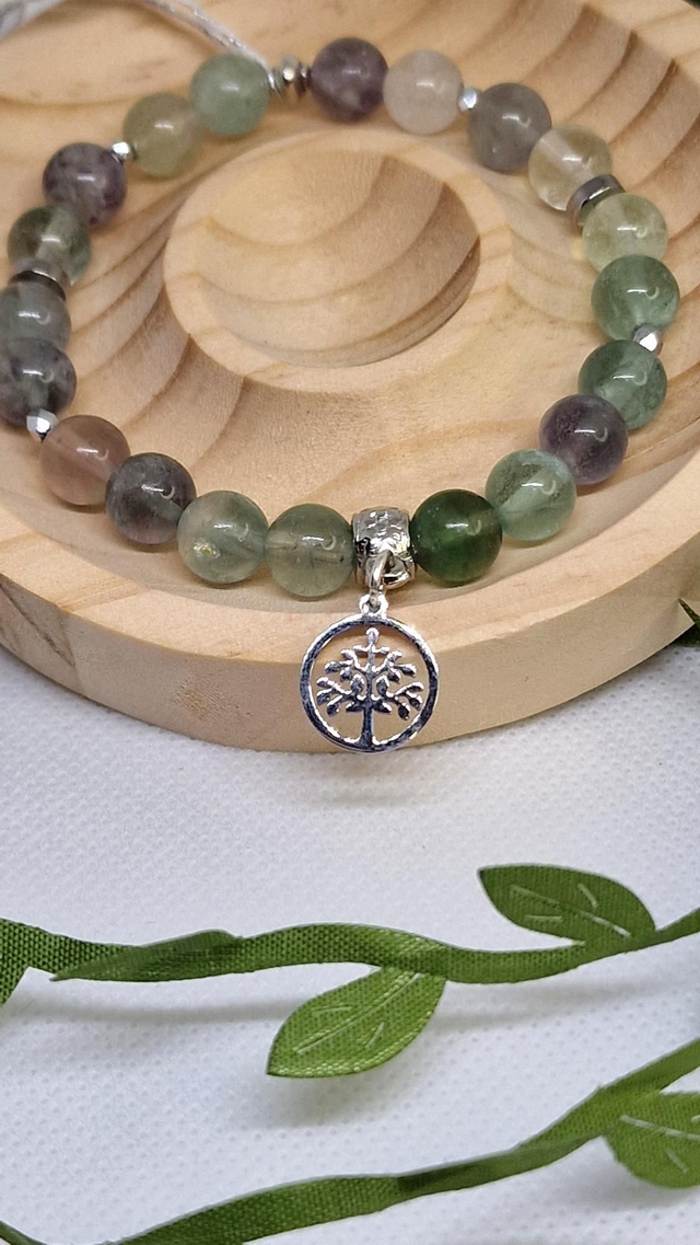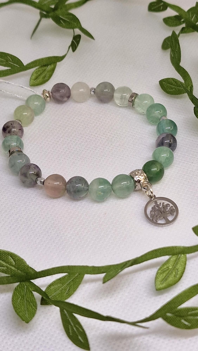 Bracelet fait main sur fil élastique solide, composé de Fluorite en 0,8cm ainsi que de perles en acier inoxydable.