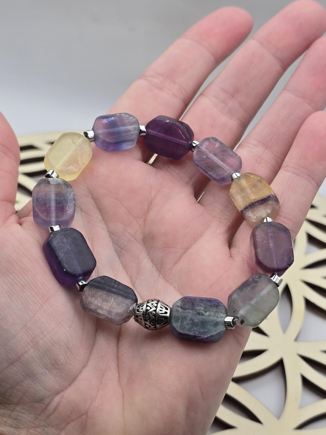 Bracelet fait main sur fil élastique solide composé de Fluorite multicolore rectangulaire d'environ 1,5 cm non polie, ainsi que de perles en hématite plaquée et acier inoxydable.