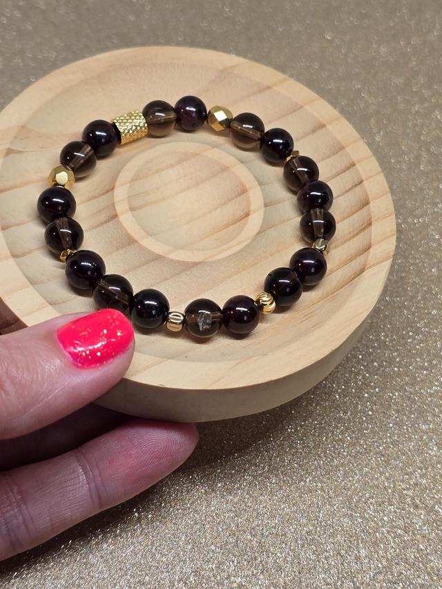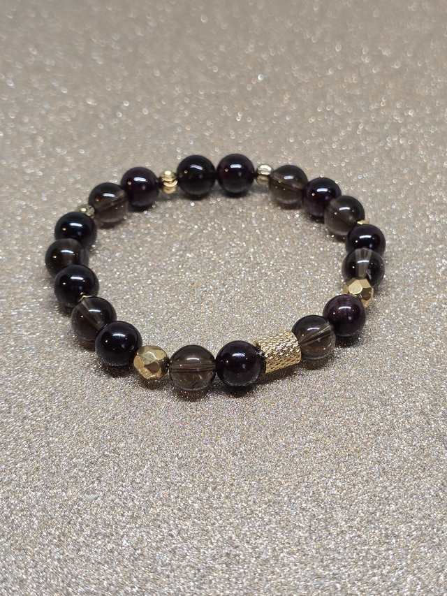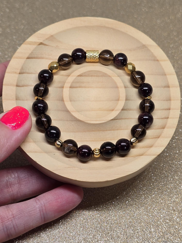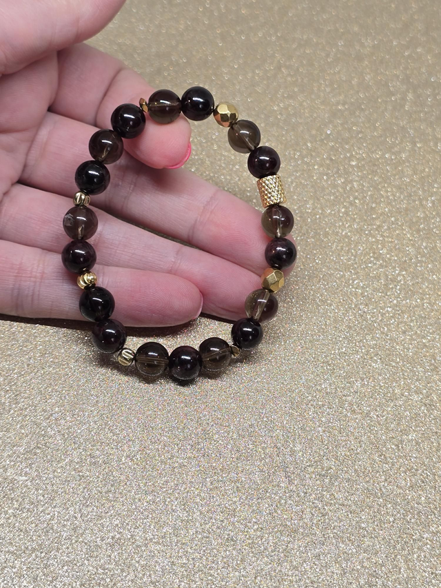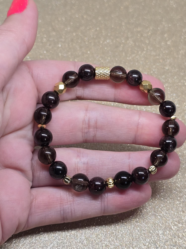 ✨Bracelet fait main sur fil élastique solide composé de Grenat et Quartz fumé en 0,8 cm ainsi que de perles plaquées et acier inoxydable.
