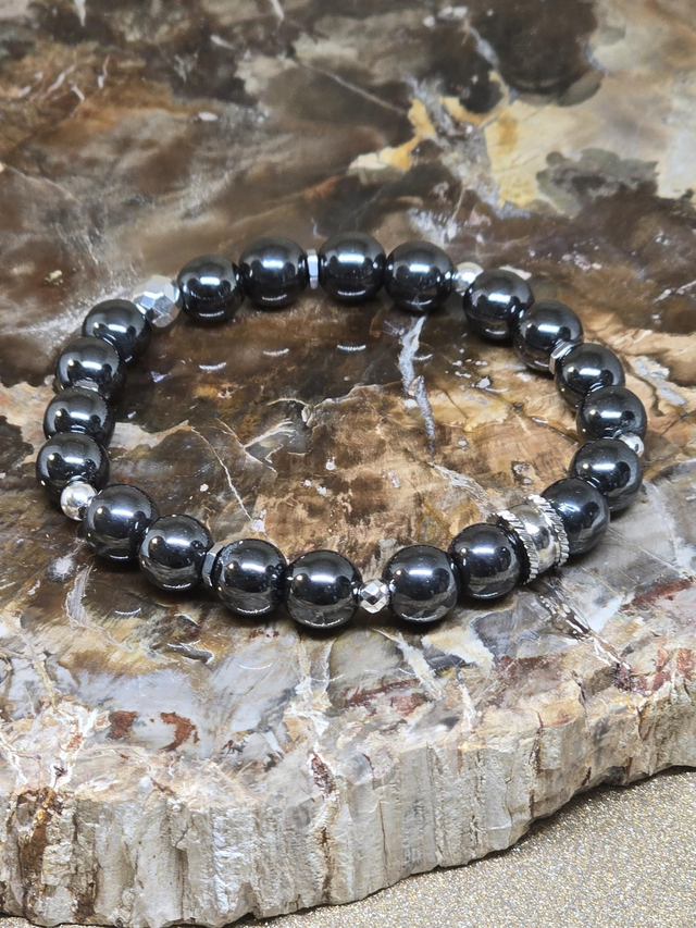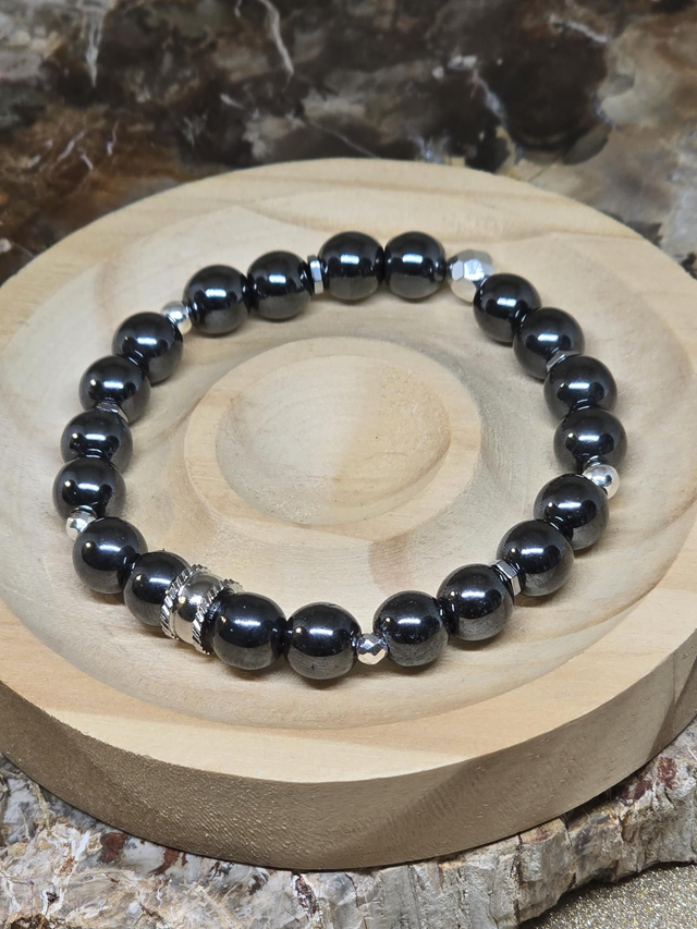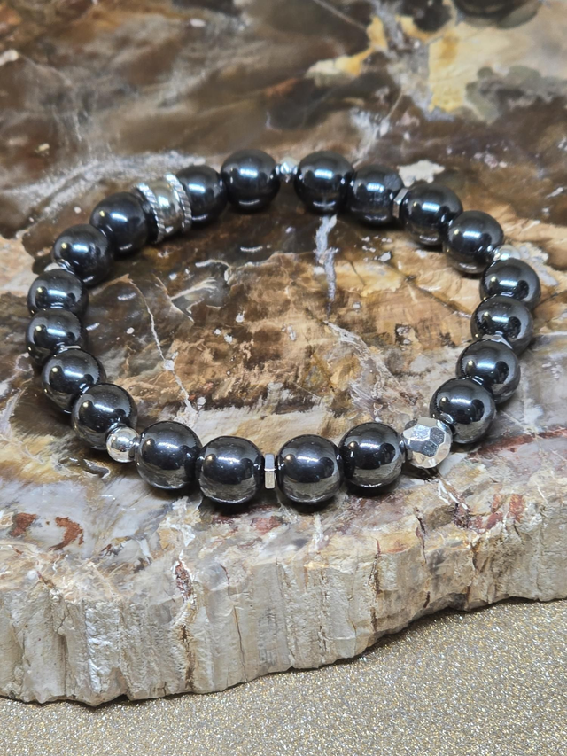 Bracelet fait main sur fil élastique solide composé d'Hématite en 0,8 cm ainsi que de perles en hématite plaquée et acier inoxydable.