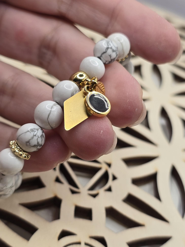 Bracelet fait main sur fil élastique solide composé d'Howlite en 0,8 cm ainsi que de perles en hématite plaquée et acier inoxydable.