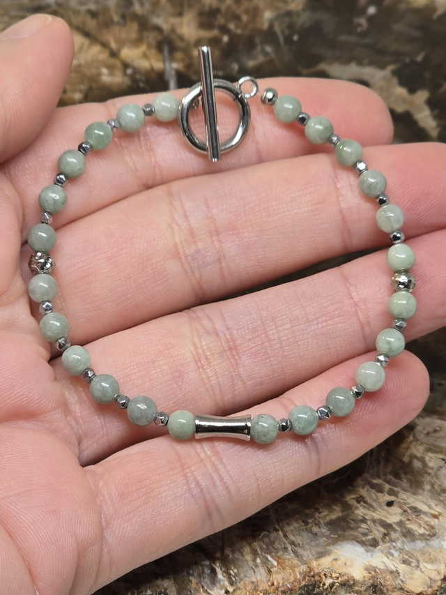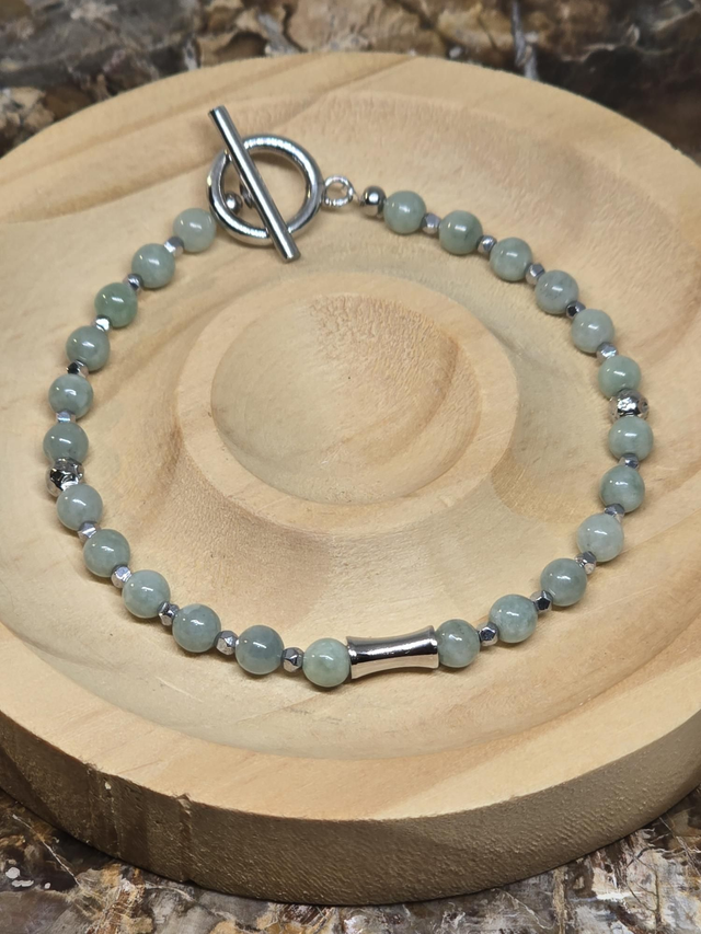 Bracelet sur fil fixe avec fermoir en T acier, composé de Jade de Birmanie en 0,4 cm, ainsi que de perles en hématite plaquées et acier inoxydable.