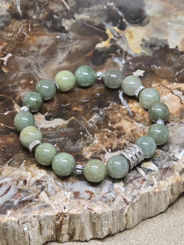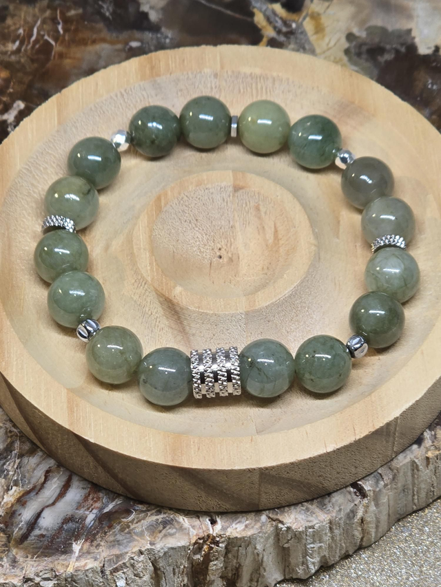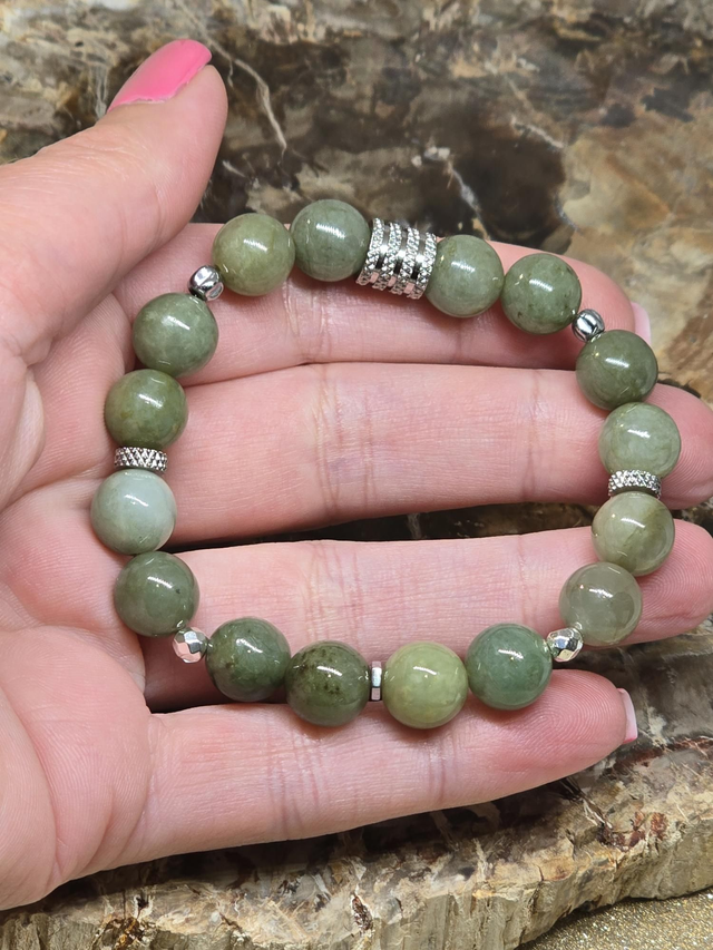 Bracelet fait main sur fil élastique solide composé de Jade vert en 1 cm ainsi que de perles en hématite plaquée et acier inoxydable.