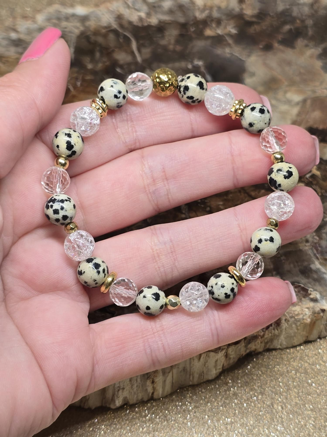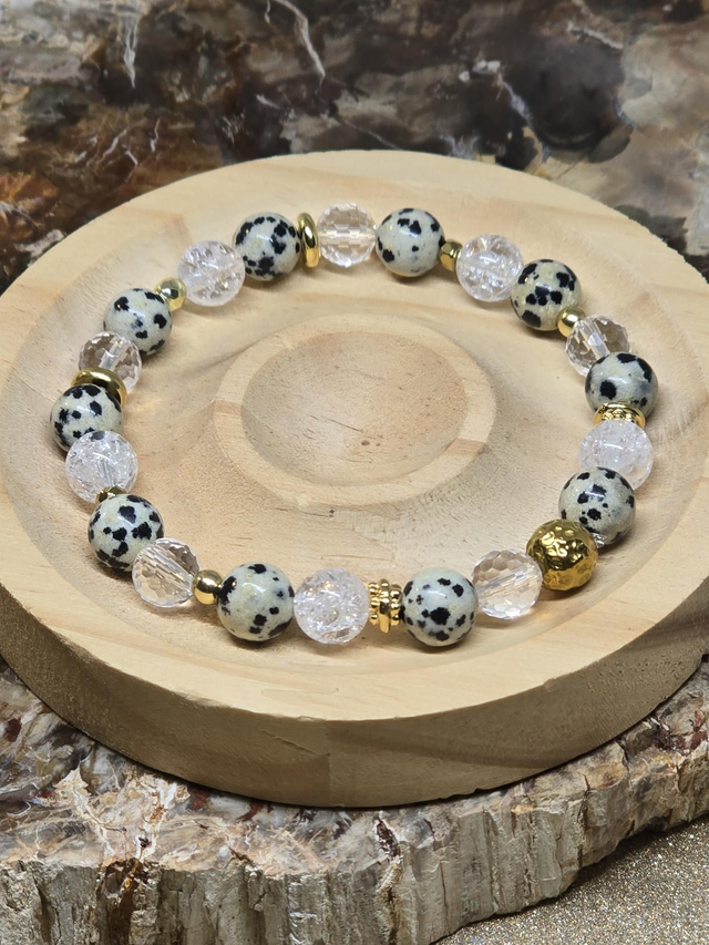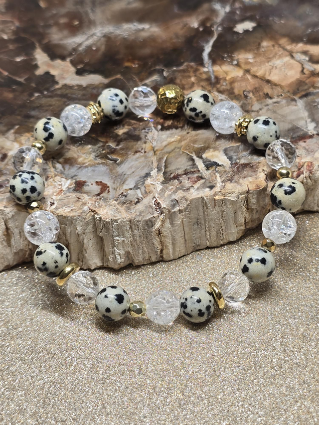 Bracelet fait main sur fil élastique solide composé de Jaspe Dalmatien et Cristal de roche en 0,8 cm ainsi que de perles en hématite plaquée.