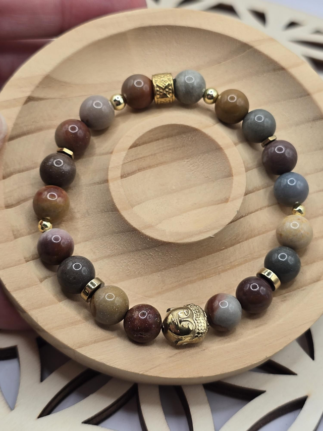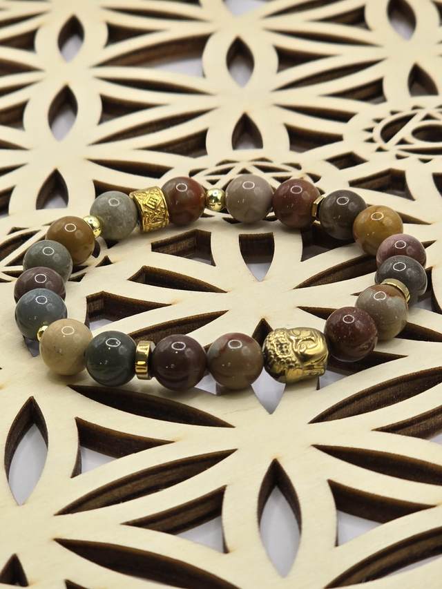 Bracelet fait main sur fil élastique solide composé de Jaspe impérial en 0,8 cm ainsi que de perles en hématite plaquée et acier inoxydable.
