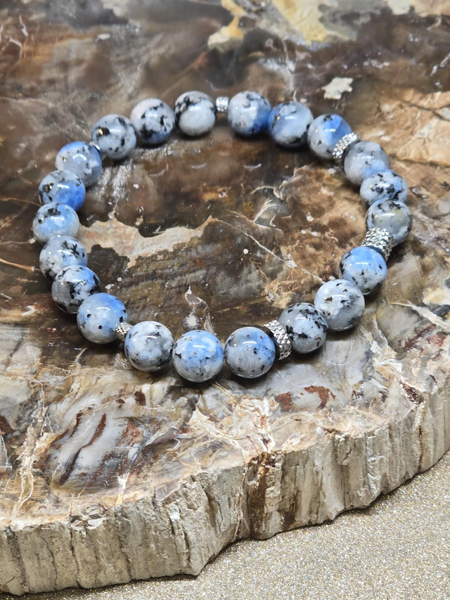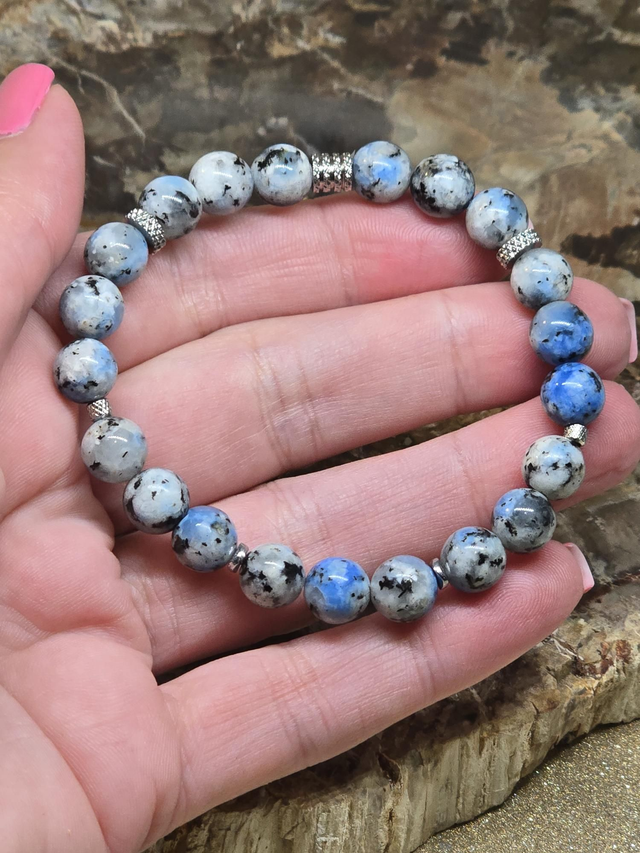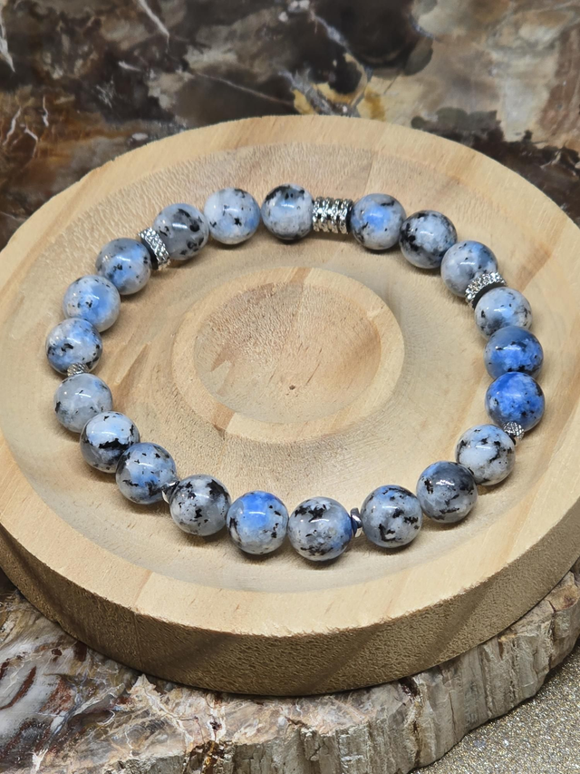 Bracelet fait main sur fil élastique solide composé de Jaspe K2 en 0,8 cm ainsi que de perles en acier inoxydable.