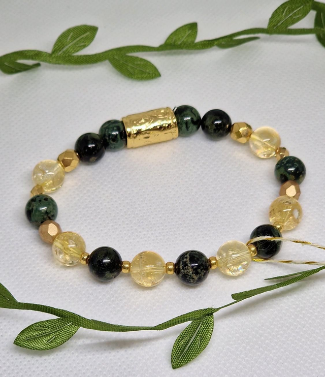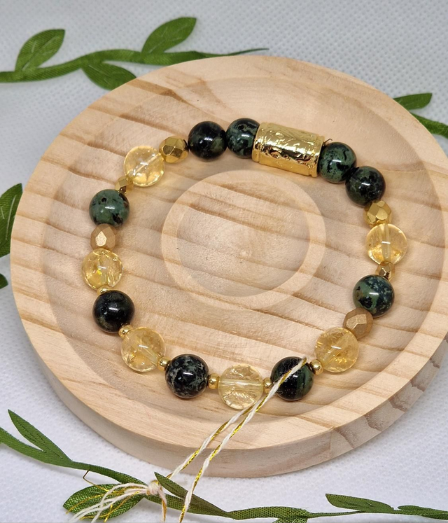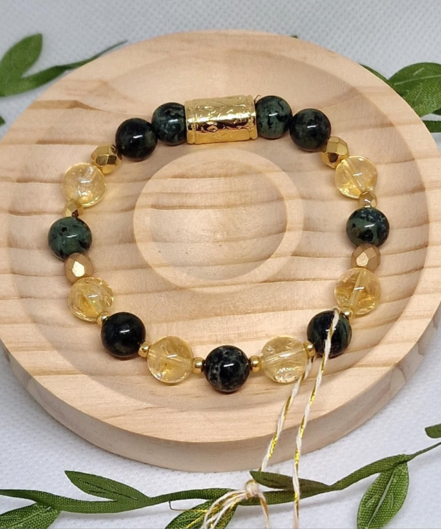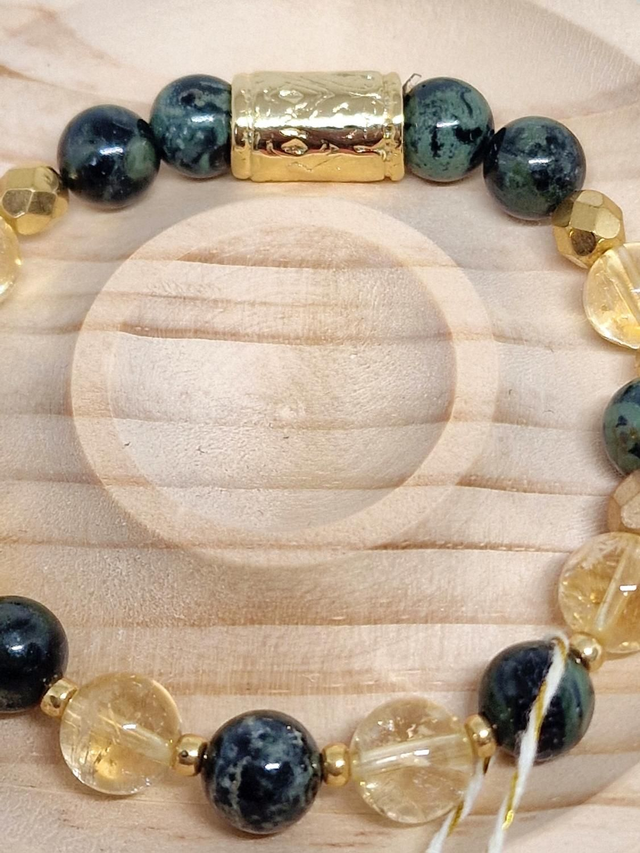 🌟 Bracelet fait main composé de Jaspe Kambaba et Citrine en 0,8 cm ainsi que de perles dorées à l'or fin.