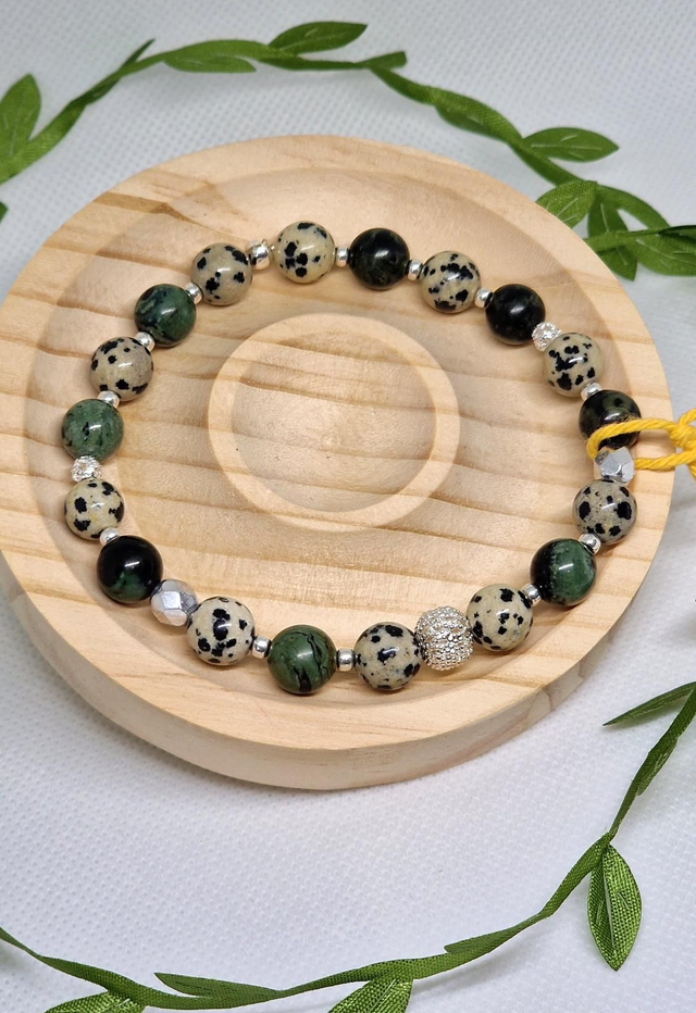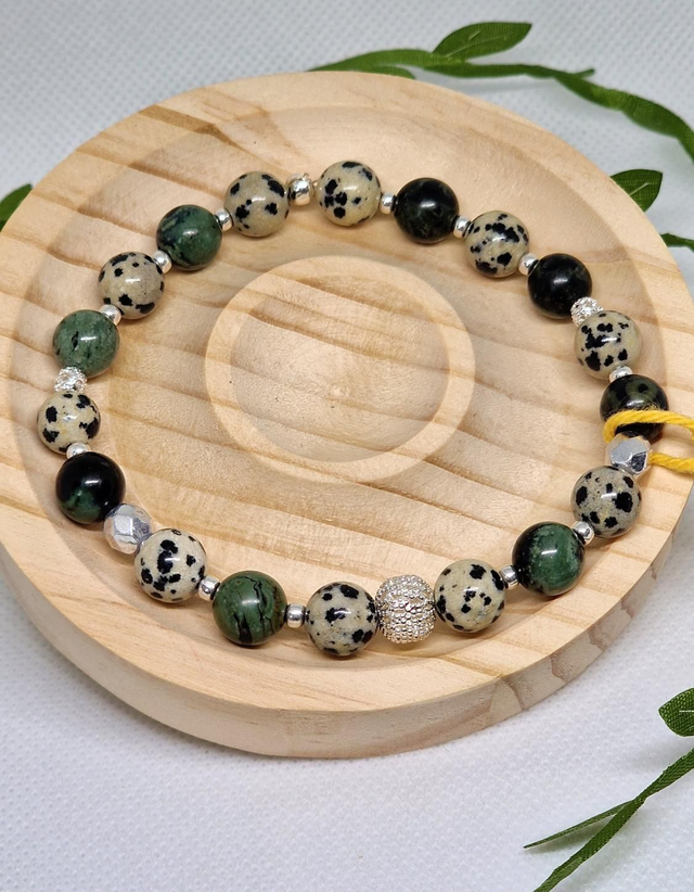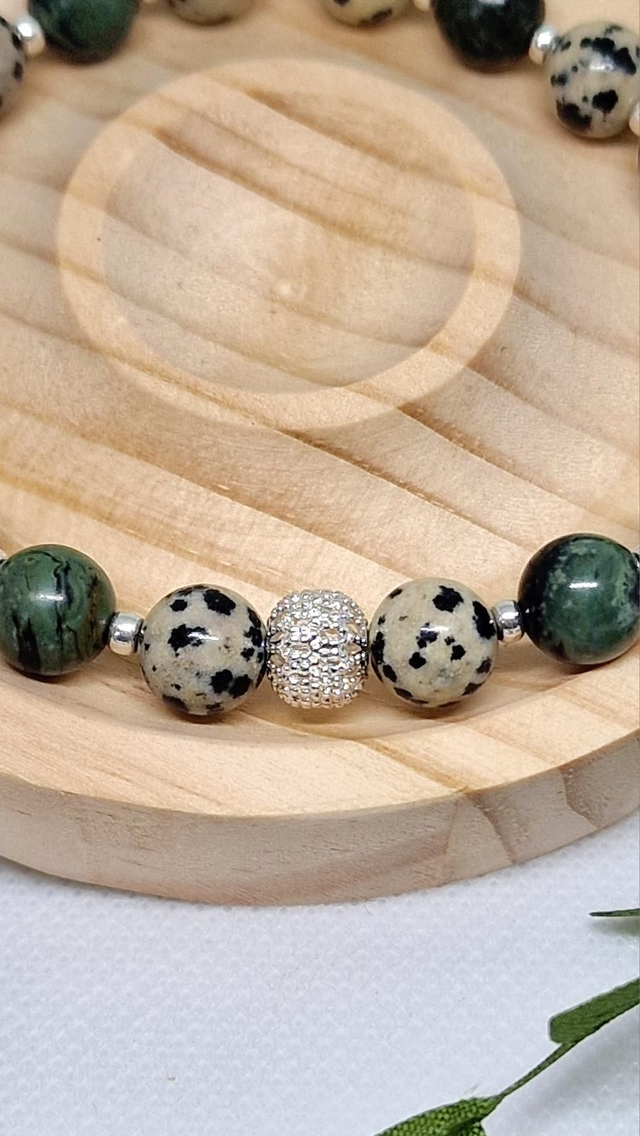 🌟 Bracelet fait main sur fil élastique solide et composé de Jaspe dalmatien et Jaspe Kambaba en 0,8 cm ainsi que de perles en argent et acier inoxydable.