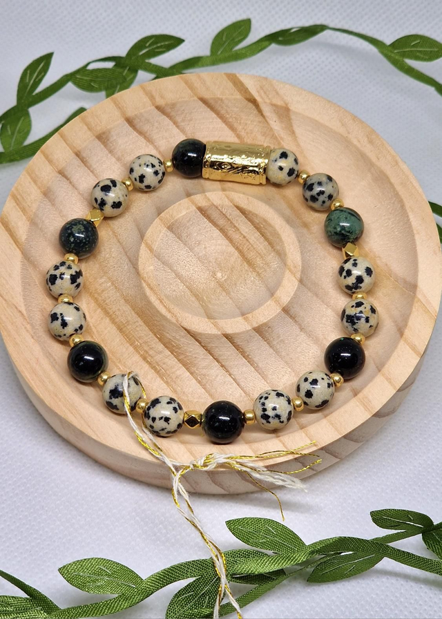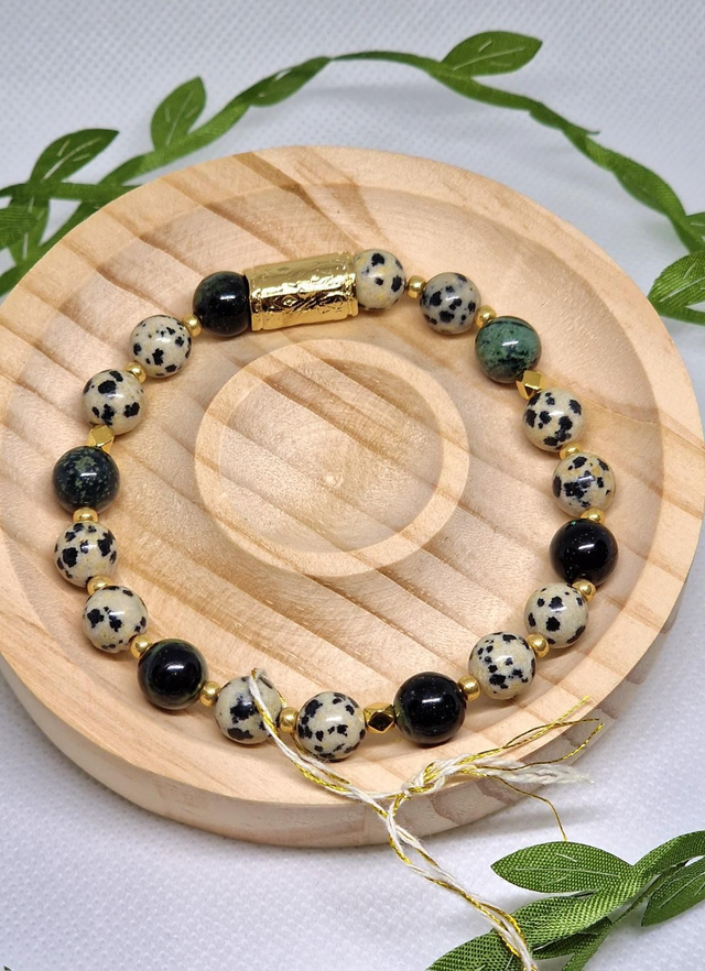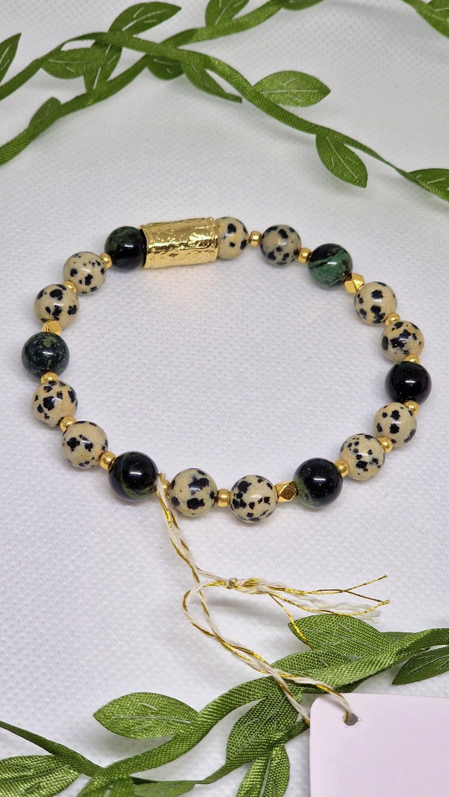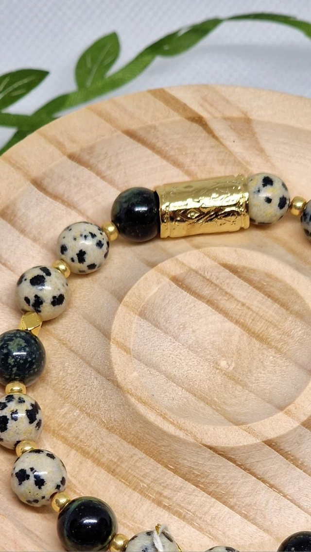 🌟 Bracelet fait main sur fil élastique solide et composé de Jaspe dalmatien et Jaspe Kambaba en 0,8 cm ainsi que de perles dorées à l'or fin.