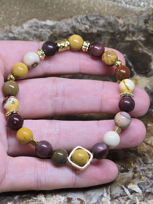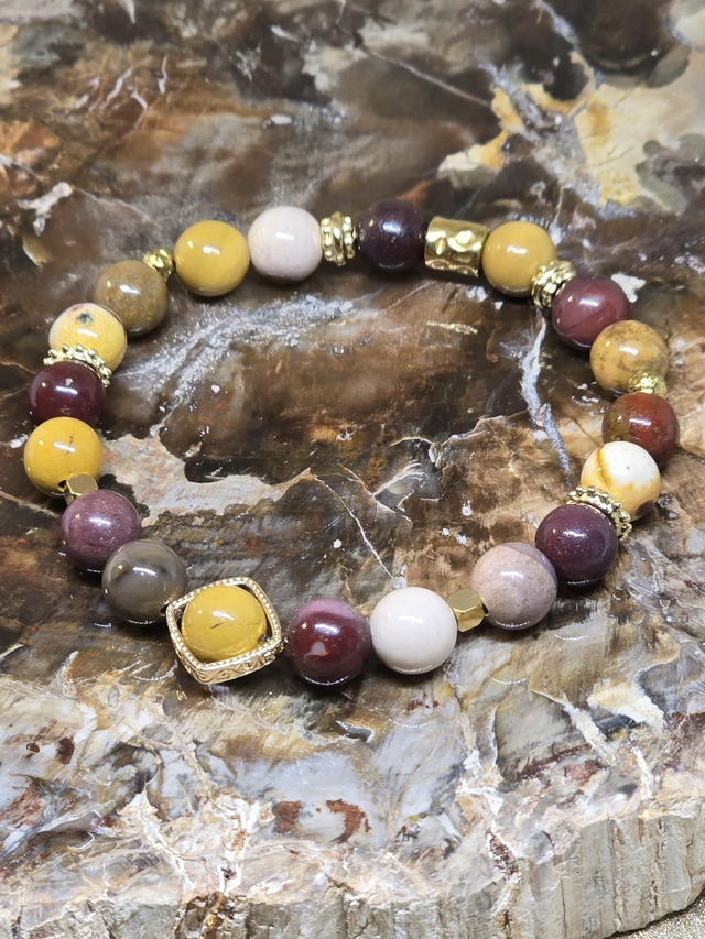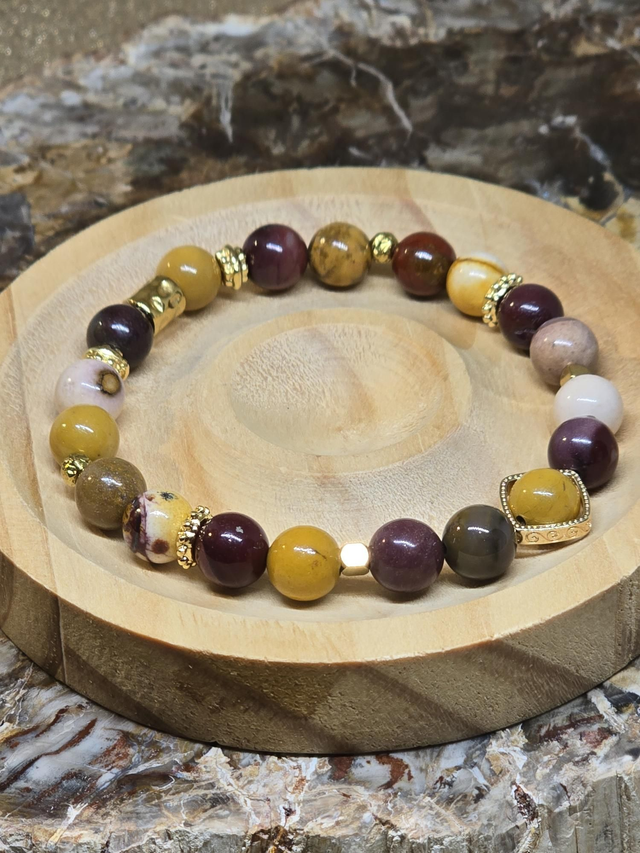 Bracelet fait main sur fil élastique solide composé de Jaspe Mokaïte en 0,8 cm ainsi que de perles en laiton et acier inoxydable.