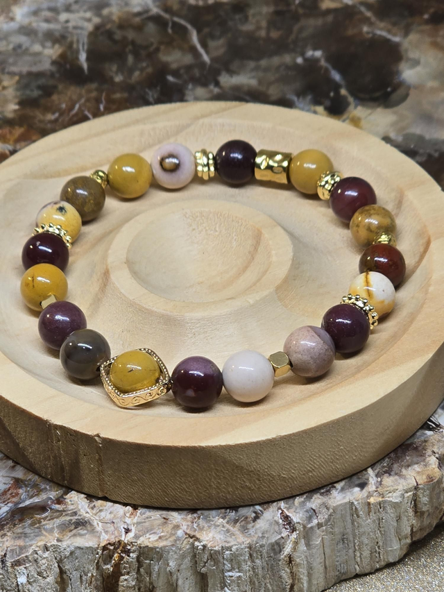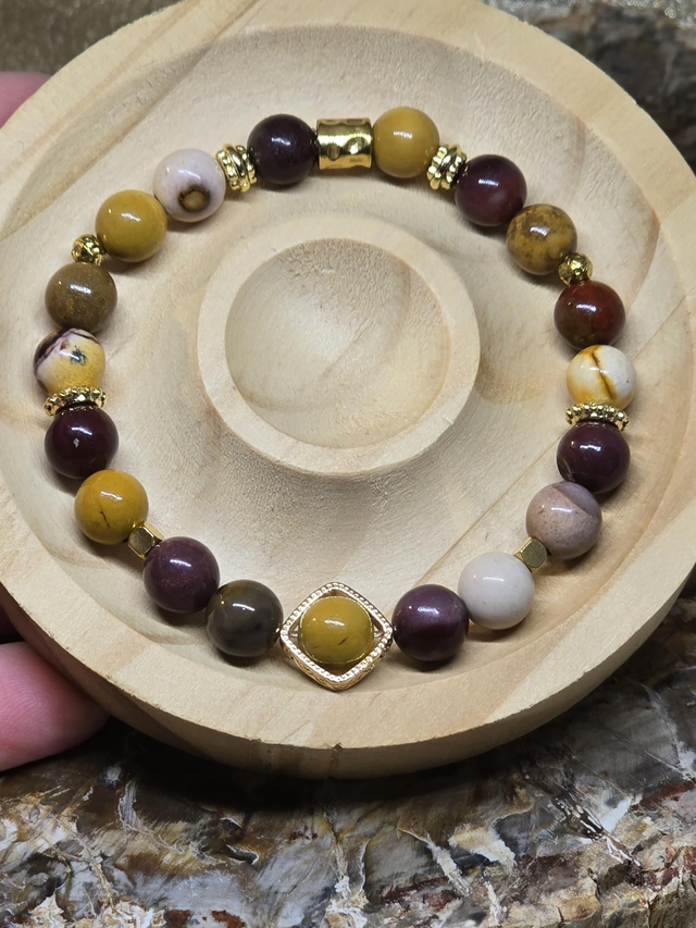 Jaspe Mokaïte : Chakra racine (marron) et sacré (jaune) : aide à se reconnecter à ses instincts, renforce la vitalité et l'énergie du corps, le courage, l'assurance, la volonté et la détermination. Il développe l'altruisme et donne envie de s'ouvrir aux autres. Procure un sentiment de compassion, d'empathie et d'attention. Il supprime l'égocentrisme et le narcissisme. Bienfaits sur le système circulatoire, renforce le système immunitaire.