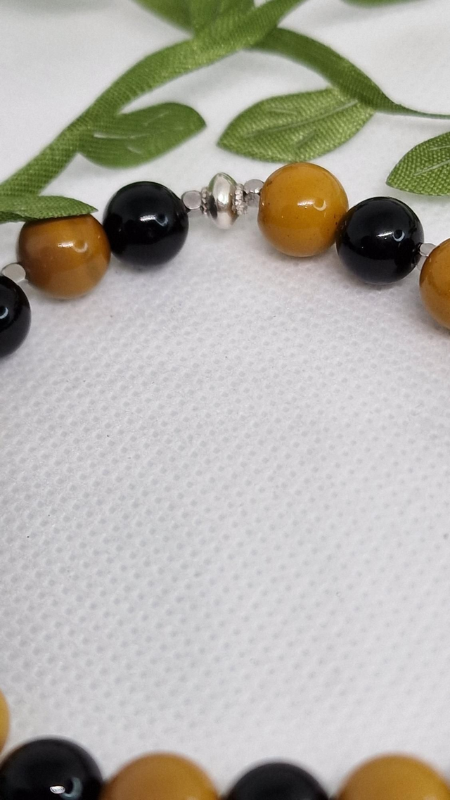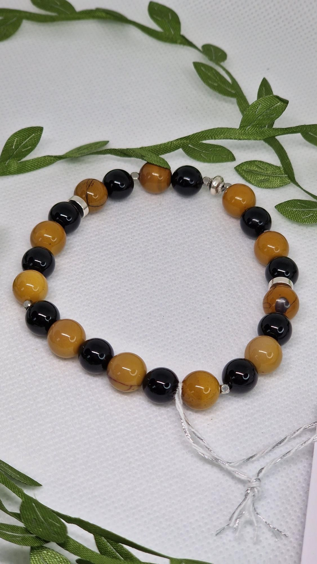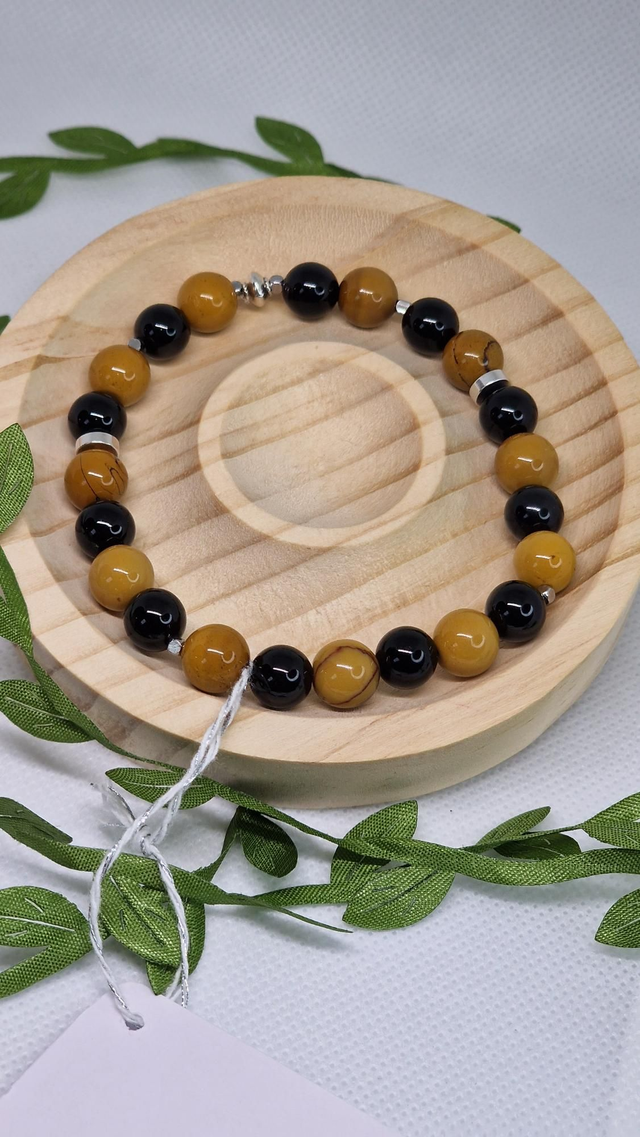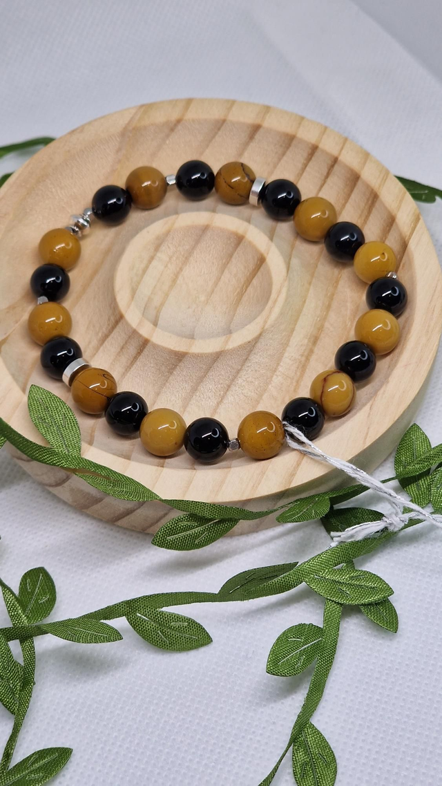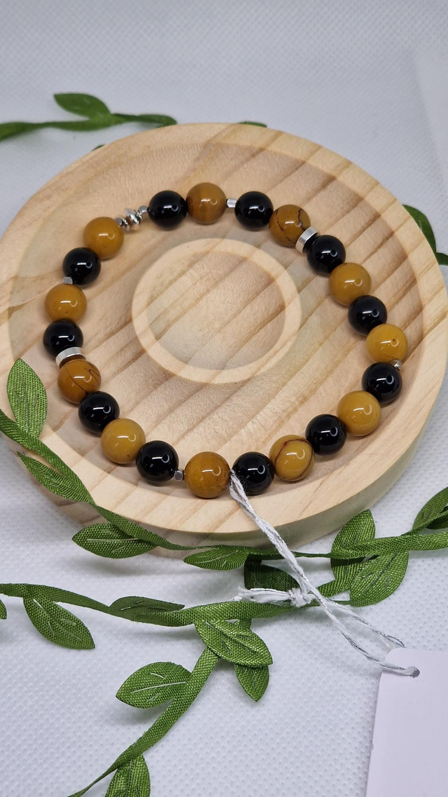 🌟 Bracelet fait main sur fil élastique solide, composé de Jaspe Mokaïte et Onyx en 0,8 cm ainsi que de perles en acier inoxydable.