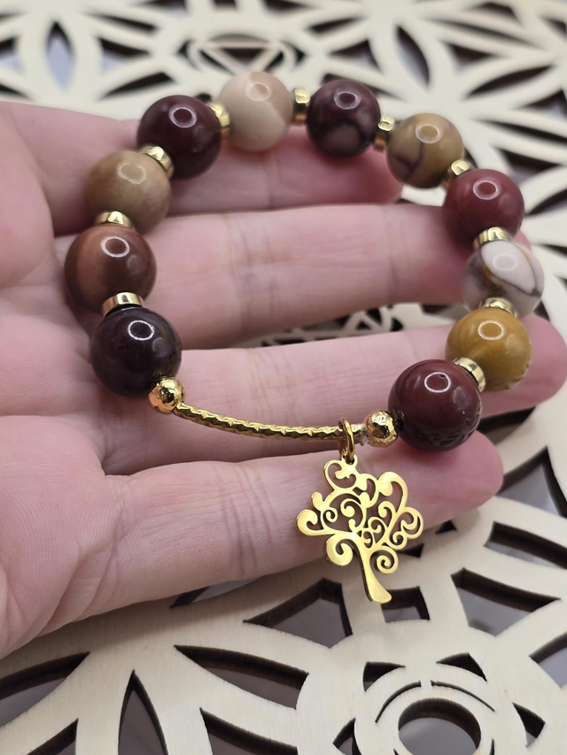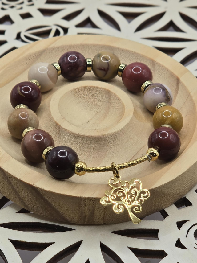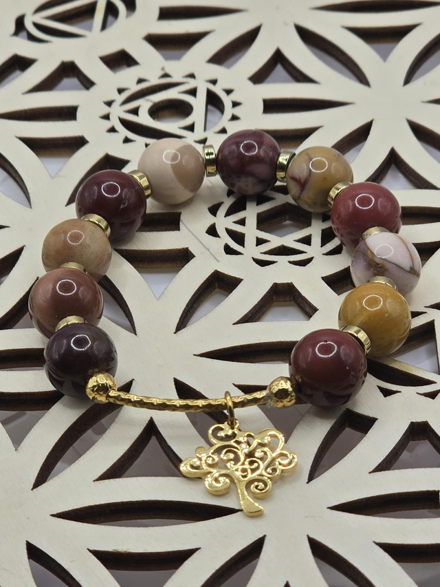 Jaspe Mokaïte : Chakra racine (rouge) et sacré (haut) : aide à se reconnecter à ses instincts, renforce la vitalité, l'énergie du corps, le courage, l'assurance, la volonté, la détermination, développe l'altruisme et donne envie de s'ouvrir aux autres. Procure un sentiment de compassion, d'empathie et d'attention. Il supprime l'égocentrisme et le narcissisme.