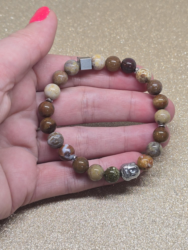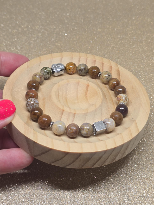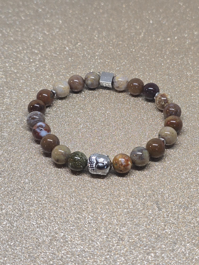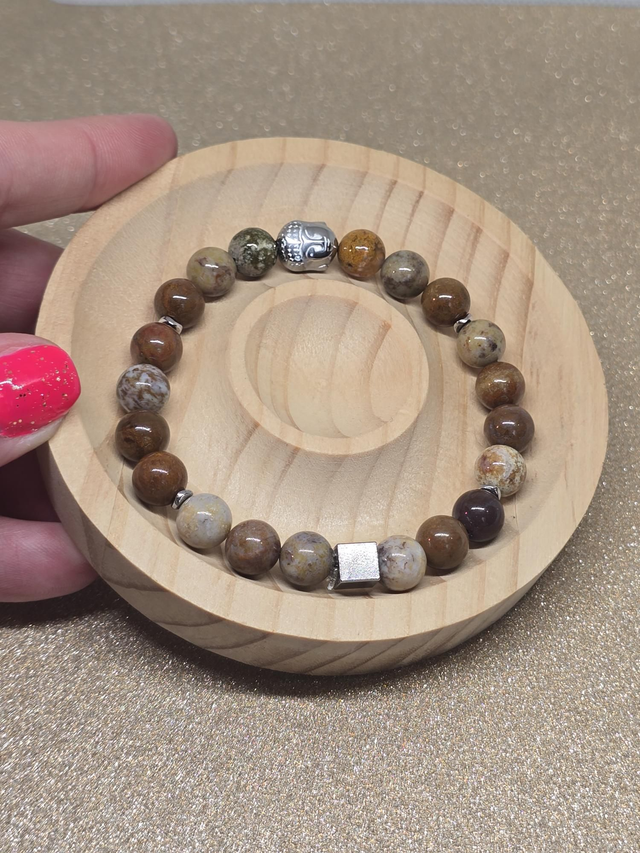 ✨ Bracelet fait main sur fil élastique solide composé de Jaspe océan en 0,8 cm ainsi que de perles plaquées et acier inoxydable.