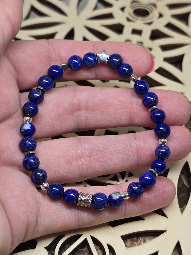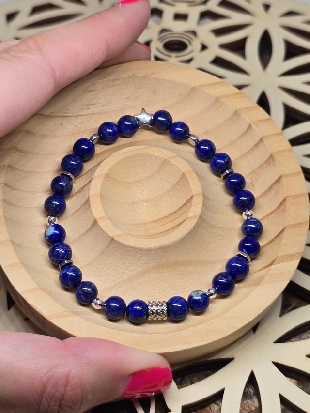 Bracelet fait main sur fil élastique solide composé de Lapis lazuli en 0,6 cm ainsi que de perles en hématite plaquée et acier inoxydable.