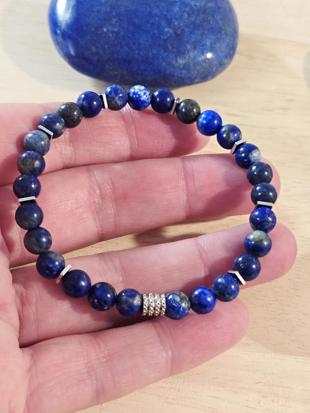 Bracelet fait main sur fil élastique solide composé de Lapis lazuli en 0,6 cm ainsi que de perles en hématite plaquée et acier inoxydable.